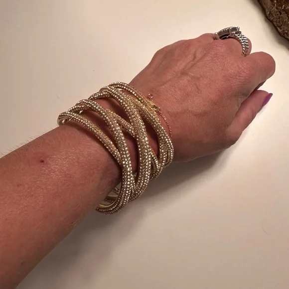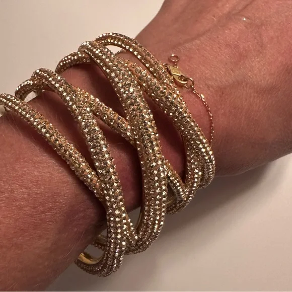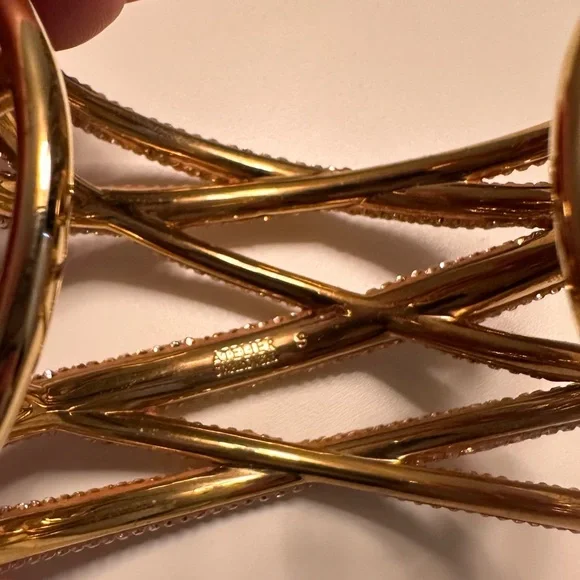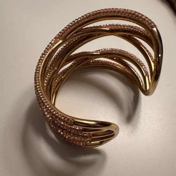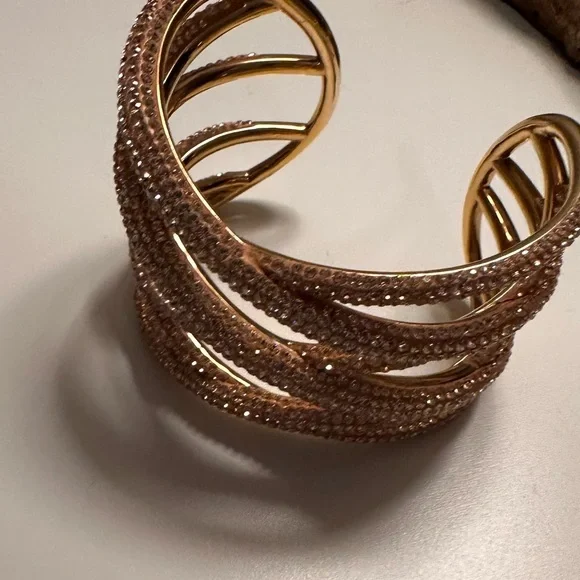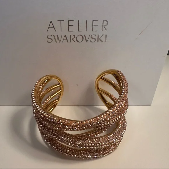 Swarovski crystal Atelier Tigris cuff bracelet. Gold-tone hardware with Swarovski crystals. Cuff style bracelet looks like three stacked crisscross bracelets. Make a statement with this gorgeous pice of jewelry. Comes with the box shown. Like new condition—this was never worn. 9.16.24