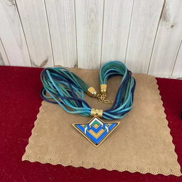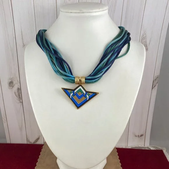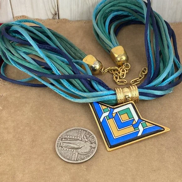 The Michaela Frey Pendant is Chevron Shaped with a Enameled Interlocking Blue, Gold, Green and White Design, framed in black and gold plated pendant and features a 2.125 x1.3/4 inch Drop . This particular design from Michaela Frey is very hard to come by an is in very good condition. It is hanging from a 18K Gold Plated 0.5 inch Tube Connector with Blue, Turquoise, and Green Silk Strands overall 18 inches in Length (Adjustable). This enamel pendant necklace is a perfect gift for a collector of Michaela Frey Enamel Classics and others who love beautiful Jewelry!