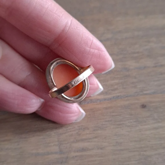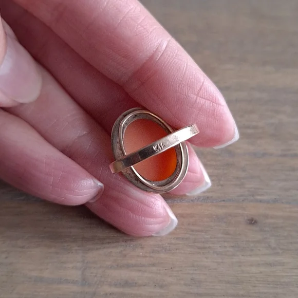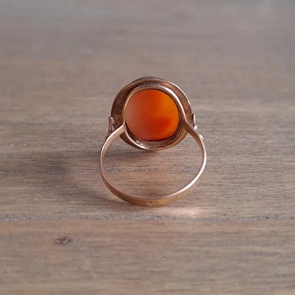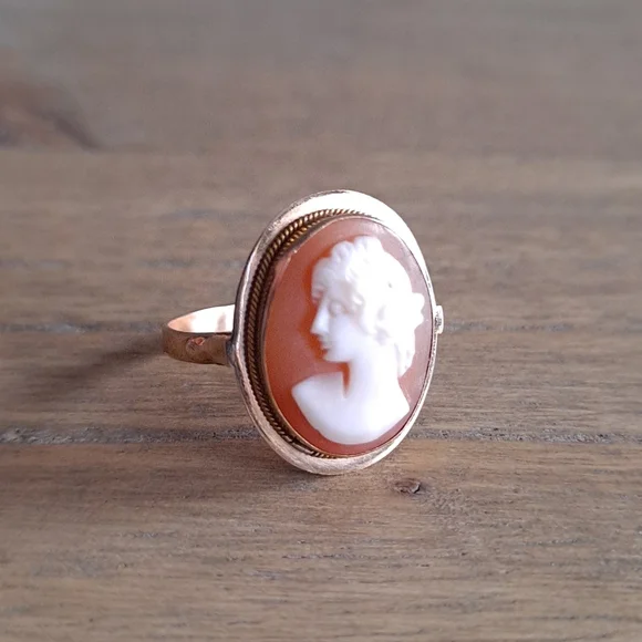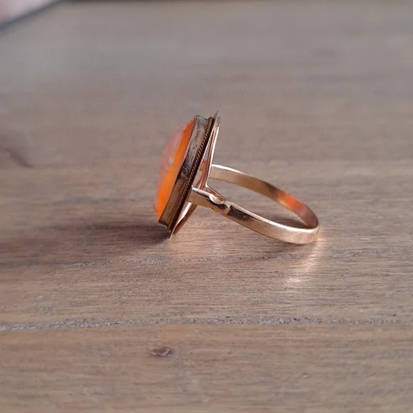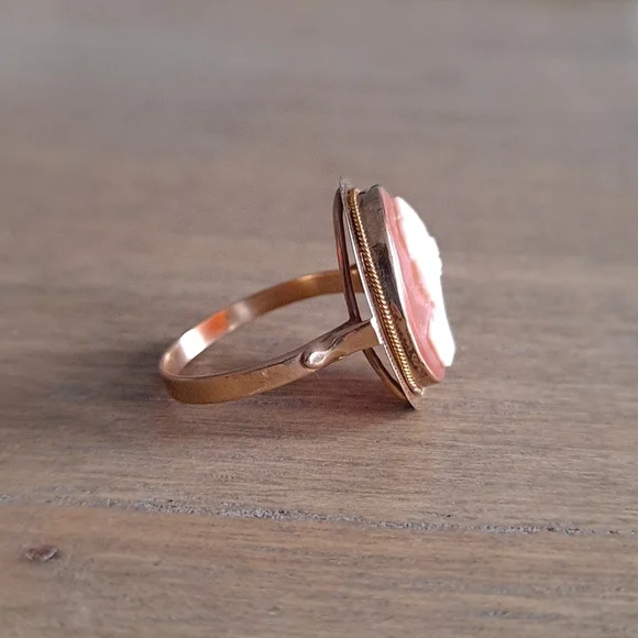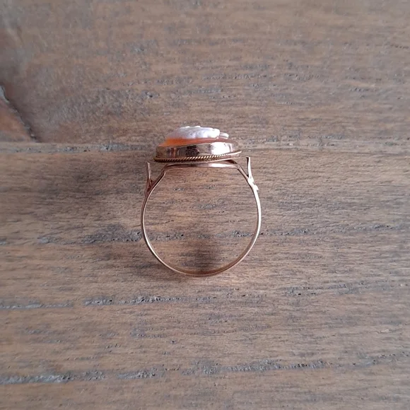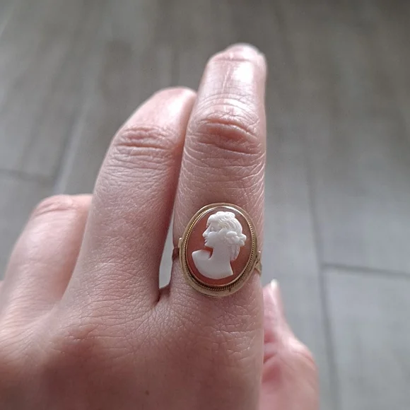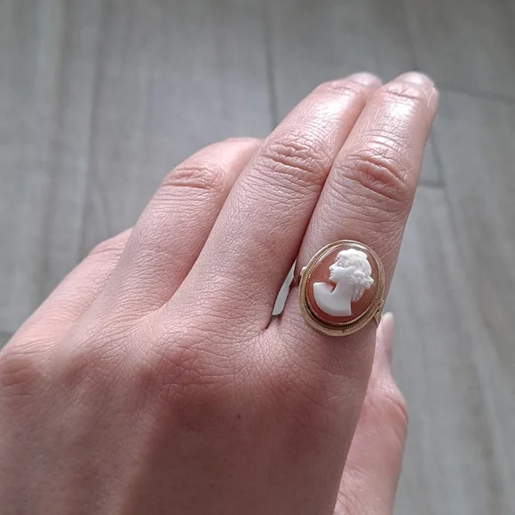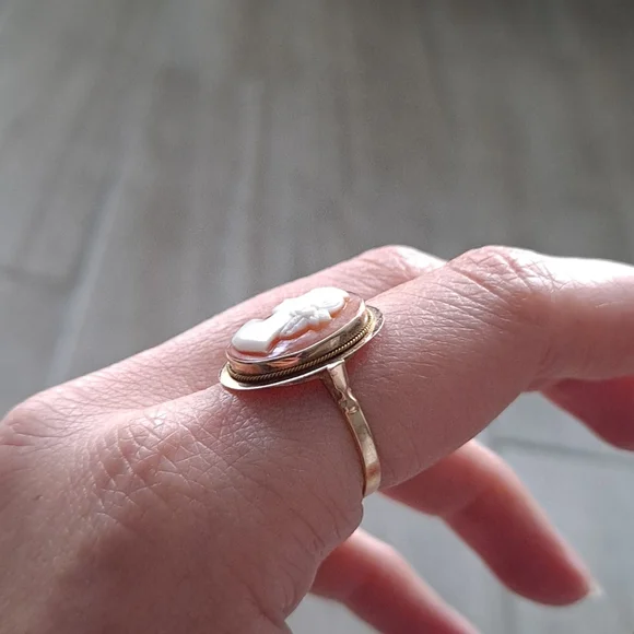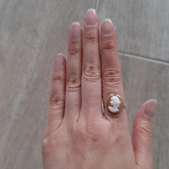 Gorgeous cameo ring made of 14K gold and carved shell.Classic and timeless. Antique feel.Perfect for everyday wear. I don´t know the exact size, but it fits like a 7 on me.