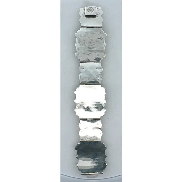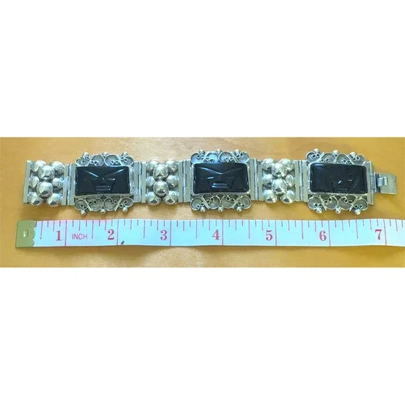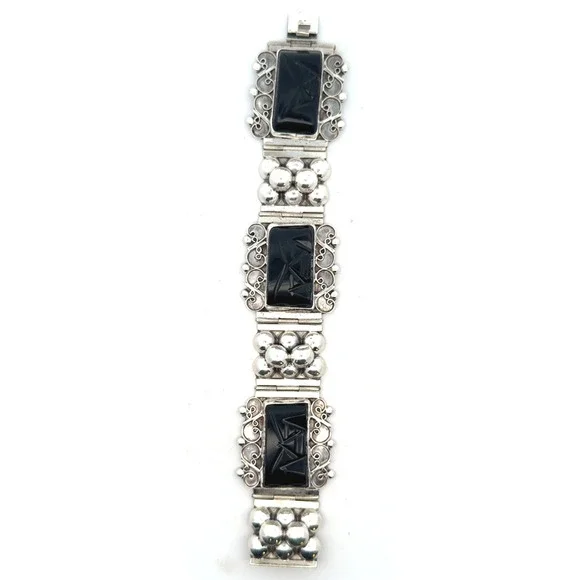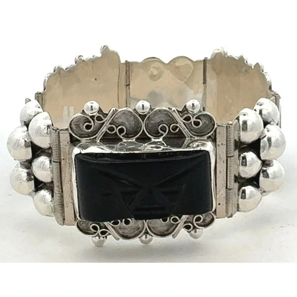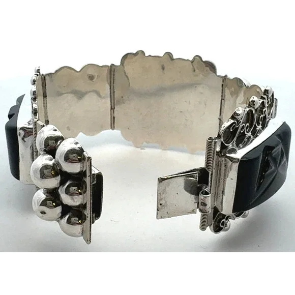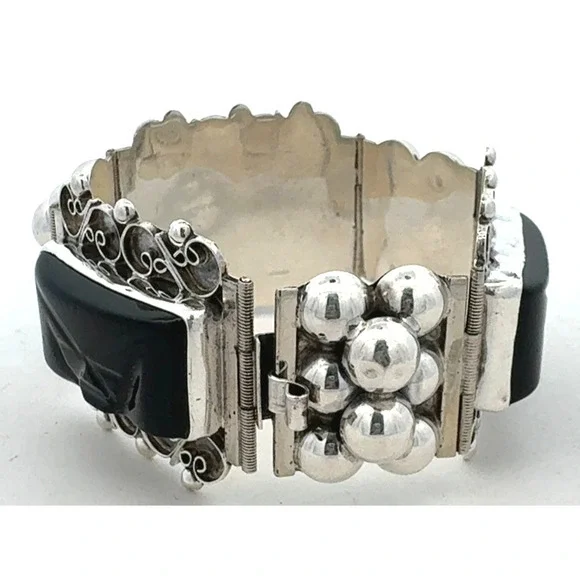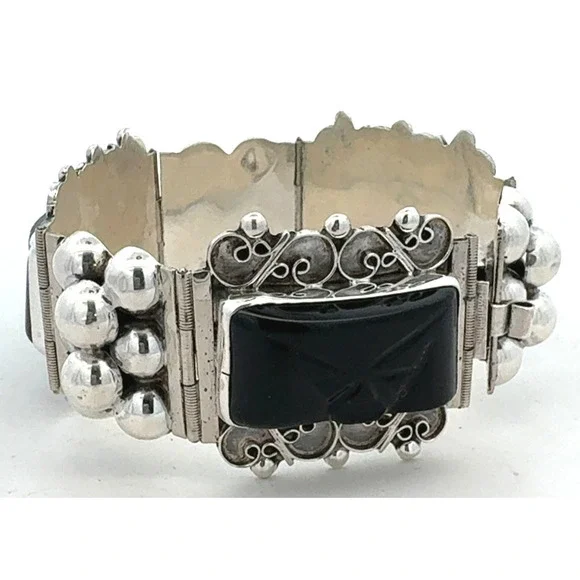 CBR Taxco Mexico 925 Sterling Silver Carved Black Onyx Statement Panel Bracelet