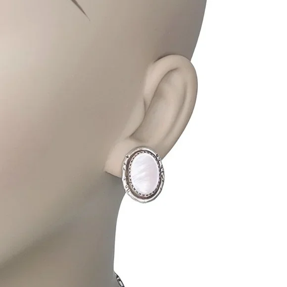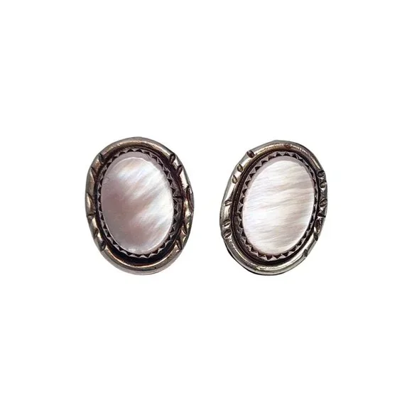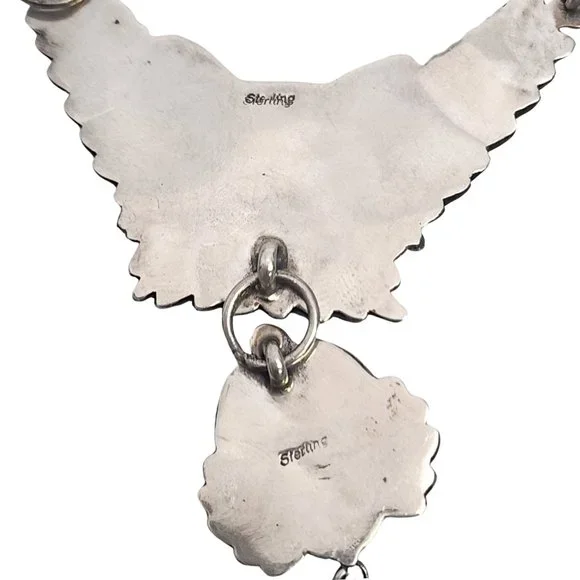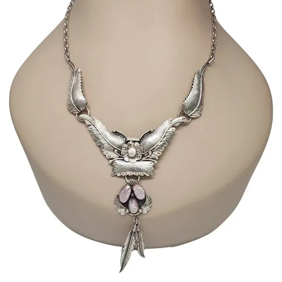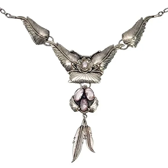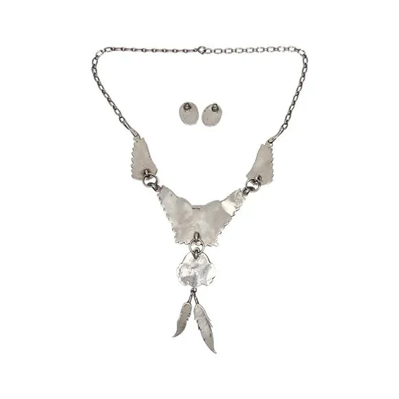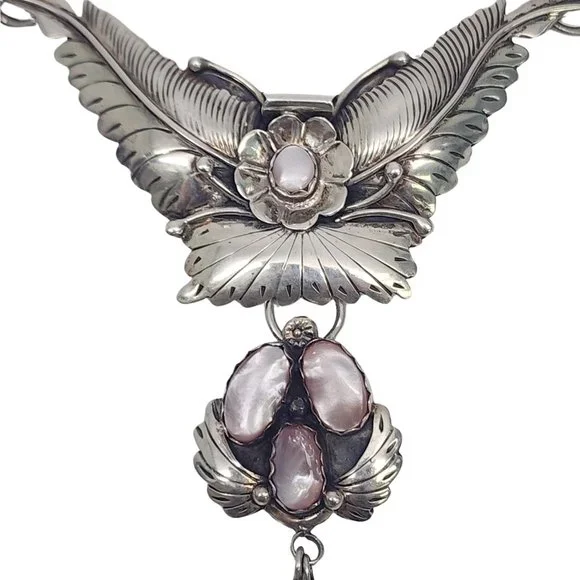 Native American sterling silver and pink shell feather necklace and earrings set.Beautiful iridescent pink shells adorn this bib necklace featuring feather design and feather dangles. Matching oval saw-tooth bezel set pink shell earrings.Weighs approx 43.6g, 28.0dwt.Necklace measures approx 18" long, stones measure approx 11.5mm x 6mm. Earrings measure approx 3/4" high, 9/16" wide, stones measure approx 13.5mm x 10mm.Necklace marked Sterling in 2 places. Earrings are not marked, test for silver.Very nice condition with slight surface scratching and light tarnish.Will come packaged in a gift box or pouch (when possible) and will be shipped US Priority Mail with insurance.CL011624/17KCS