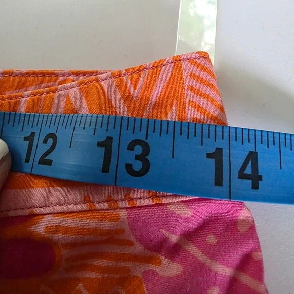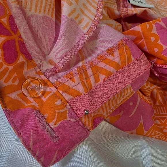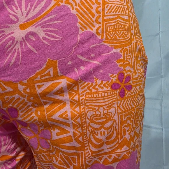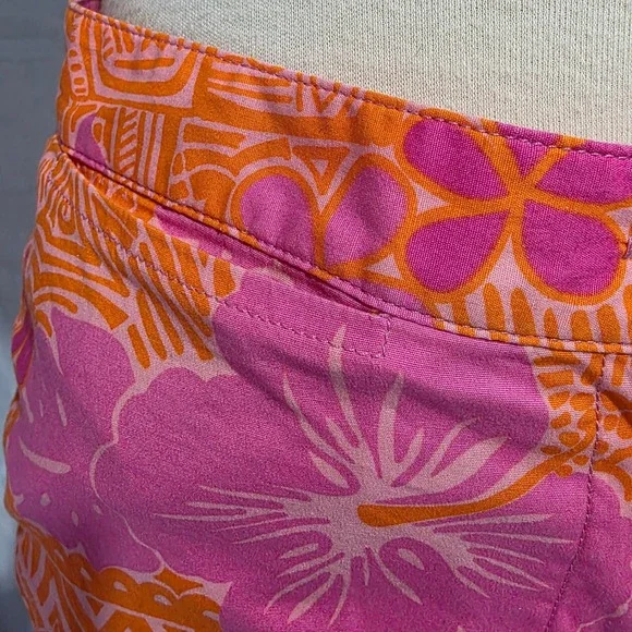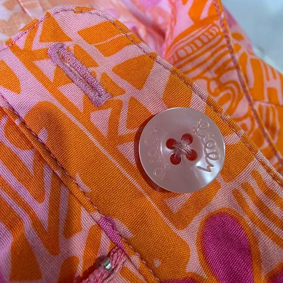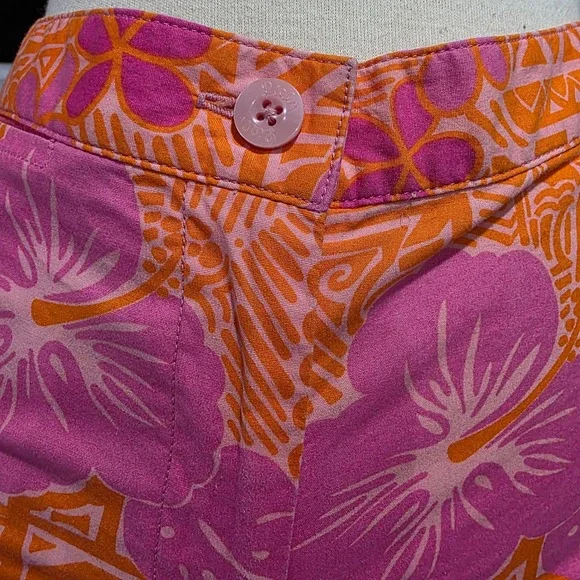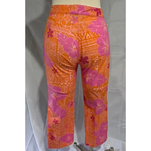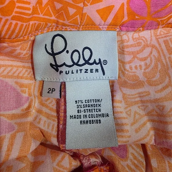 Island vibes meet modern comfort in these vibrant Lilly Pulitzer cropped pants. A burst of pink and orange floral patterns dances across the bi-stretch fabric, creating a playful yet sophisticated look. The cropped length adds a touch of contemporary flair, while the comfortable fit ensures all-day wearability. These pants are perfect for a sunny brunch, a casual day at the office, or a weekend getaway.Waist: 14"Inseam: 22"Style: CroppedColor: PinkDepartment: WomenType: PantsMaterial: Cotton, Spandex, Cotton BlendLeg Style: StraightFabric Type: KnitFeatures: Stretch, Lightweight, Breathable, Easy CareClosure: ButtonPattern: FloralAccents: ButtonOccasion: Casual, Travel