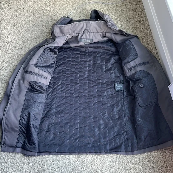 Grey coat with detachable and adjustable hood. Has 2 zip pockets and button pockets in the chest area and 2 hand pockets. There’s also 3 inner pockets.