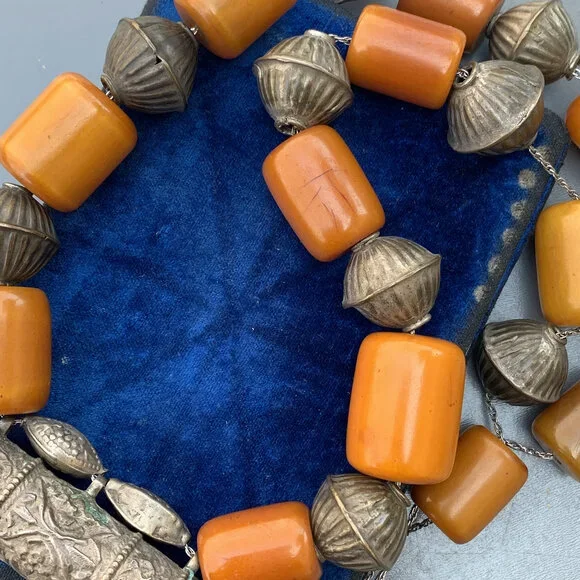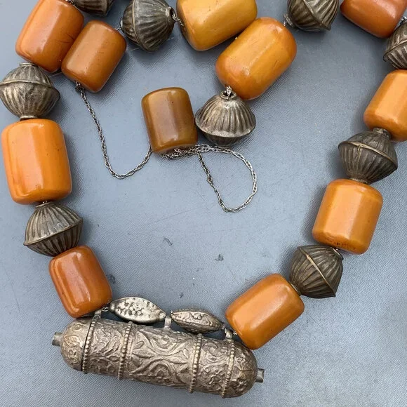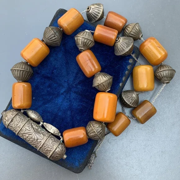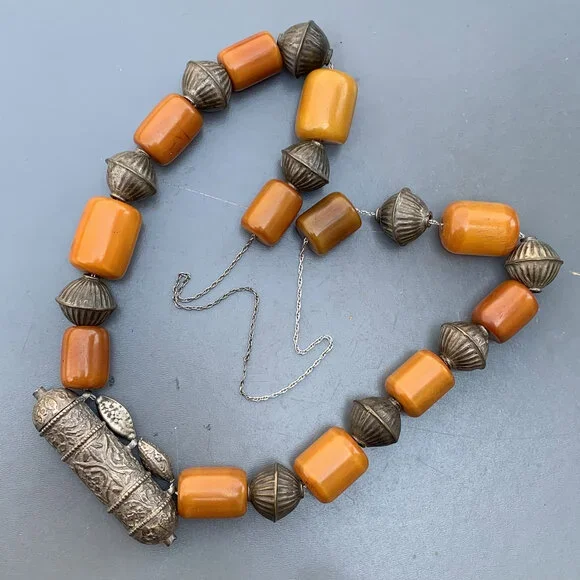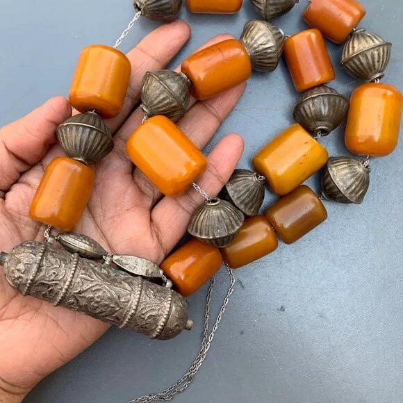 Vintage Bedouin / Yemeni pendant /amulet / hirz necklace with large Butterscotch Amber beads with hollow silver plated ribbed beads in between .Unsigned /unmarked ...Bakelite tested for simichrome and are beautifully aged with variation/ darkening of color on the edges which would only come with age and exposure to heat and light.Materials :Bakelitesilver plated or very lower grade silver metal Measures :Total necklace is 37 inches in length x 7/8 inches max width ( Somebody has added the beads through long chain ,originally it must be woven through a thread ~ just pendant and bead portion is . Bakelite beads are approx 23 inches in length ) ~ Bakelite beads are approx 1 inches x 3/4 inches max width . Weighs 195 grams on my weighing scale .Condition :´Considering the age I will say the necklace is in good vintage condition with heavy age patina to metal ~ No major cracks or chips to the beads , only for some surface wear ~ Heavy age patina to silver plated beads ~ As mentioned above beads are restrung through a chain which is added later on . Please Note ~ As vintage items are previously loved /used please do expect some minor wear like surface wear /dents /dings and metal discoloration . All items are carefully inspected and major flaws will be listed separately ~ Plenty of photograph are added so please study the photos carefully as it is also part of description or if you need more pictures just message us we will be happy to provide them :)
