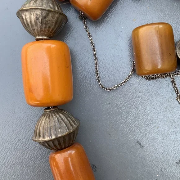 Vintage Bedouin / Yemeni pendant /amulet / hirz necklace with large Butterscotch Amber beads with hollow silver plated ribbed beads in between .Unsigned /unmarked ...Bakelite...