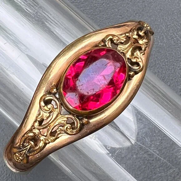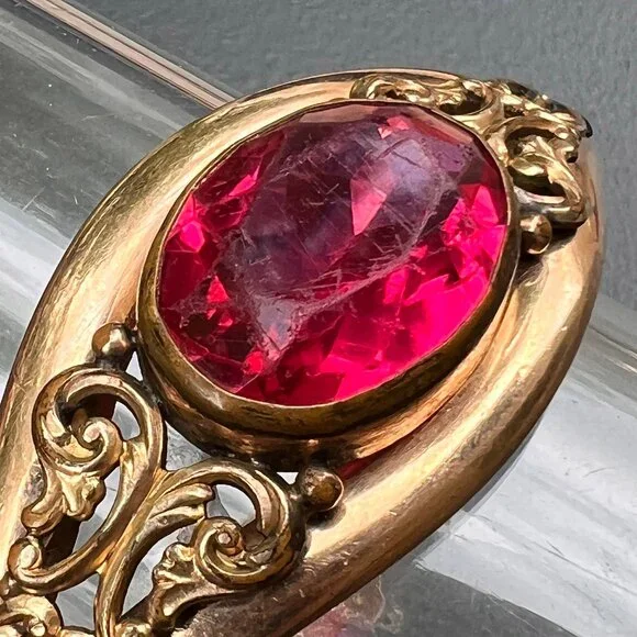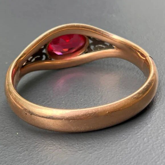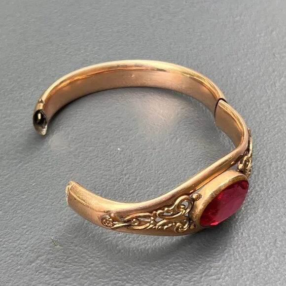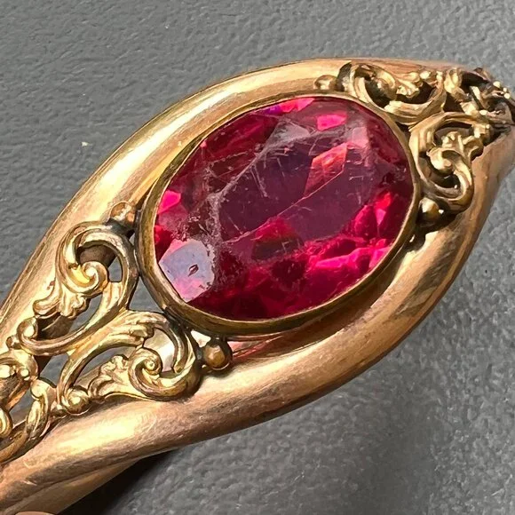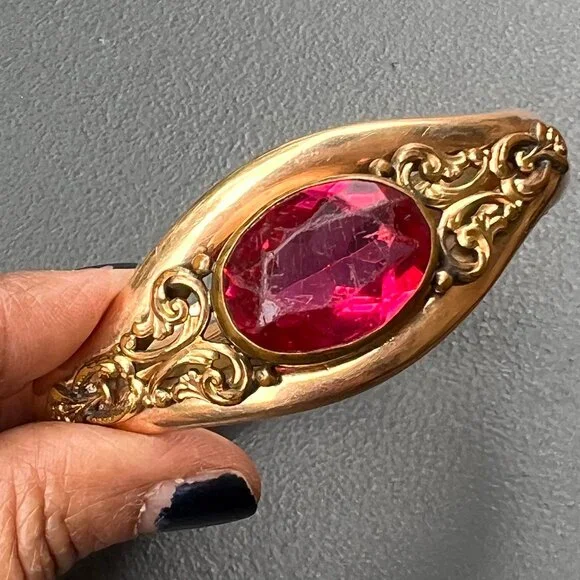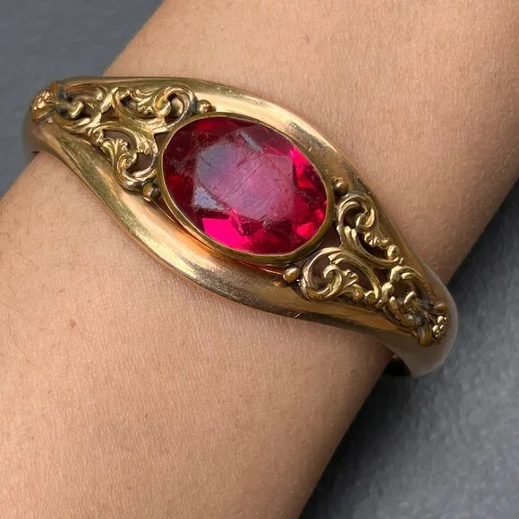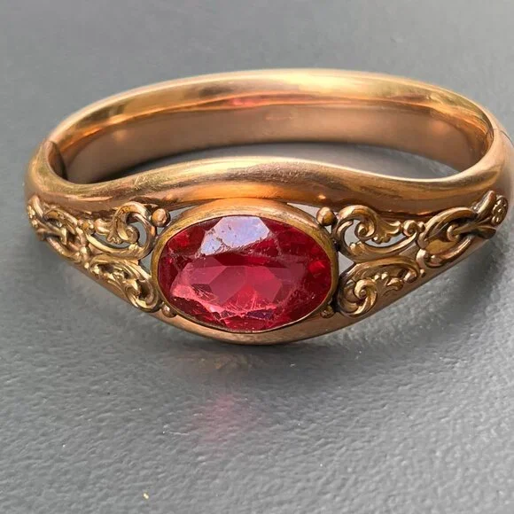 Fabulous ~ Antique Victorian Signed AC & Co ~ rose gold filled Hinged ~ Bangle with hidden clasp (opens with a small push-up button ) ~ The front of bangle has applied scroll design with a large open-back , faceted pink glass cab in center ~ Back is plain .marked AC & Co (acid tested for gold filled )Dates " late 19th to early 20th century Measurements :Bangle can fit max wrist size of 7 1/2 inches x 1 1/8 inches max width in center ~ Inner diameter is 2 3/8 inches x 2 1/4 inches Weighs 41 grams on my weighing scale .Condition:Good antique condition ~ I did not see any dent just for 1-2 ball pen point dings which are noticeable on closer inspection ~ Some surface wear , metal discoloration to the bangle ~ Clasp is in good working order .Please Note ~ As vintage items are previously loved /used please do expect some minor wear like surface wear /dents /dings and metal discoloration . All items are carefully inspected and major flaws will be listed separately ~ Plenty of photograph are added so please study the photos carefully as it is also part of description or if you need more pictures just message us we will be happy to provide them :)...Box is for display purpose does not included with the item .. but your items will be packed carefully and shipped promptly.Powered by ExportYourStore.com