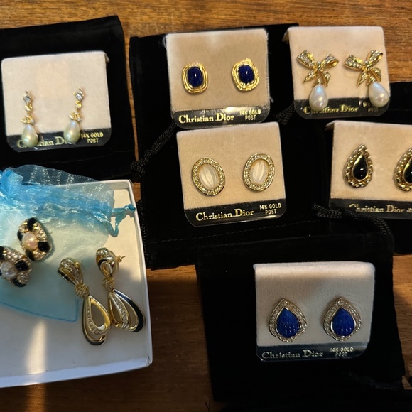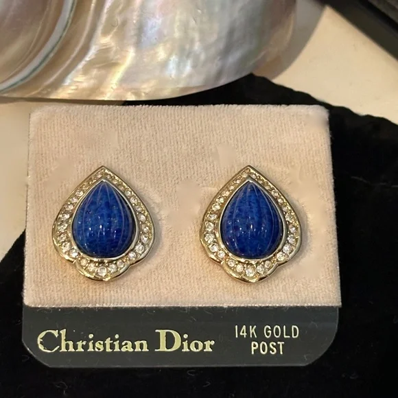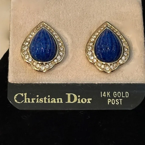 Cristian Dior Earrings - Faux Blue Lapis Lazuli & Chrystal Set in Gold - Vtg 90sBeautiful Vintage Christian Dior Earrings are gold tone metal with faux blue melon cut lapis lazuli and crystal stones. 14K Gold posts. Dior posts are well designed and very comfortable to wear. These are an exquisite classic style. Very rare and hard to find. They are in excellent NOS condition and have never been worn.NOS means new old stock . FYI Christian Dior did not sign their pierced earrings. The same styles in clip earrings are signed on the back of the clip mechanism. These are 100 percent authentic. I worked for Christian Dior for several years in the 1990s when I acquired these earrings. Estimated Retail is $450Priced at $295 Price is firmI will post a picture of the earrings next to a coin to show a size comparison shortly. The last photo shows other Dior earrings I am currently selling as well.