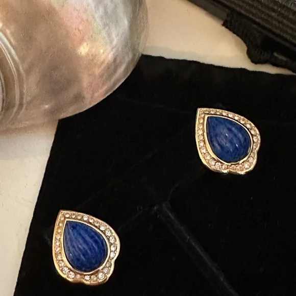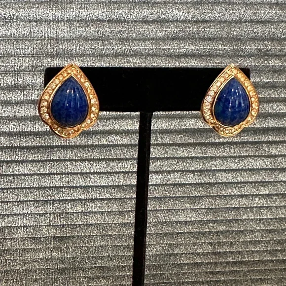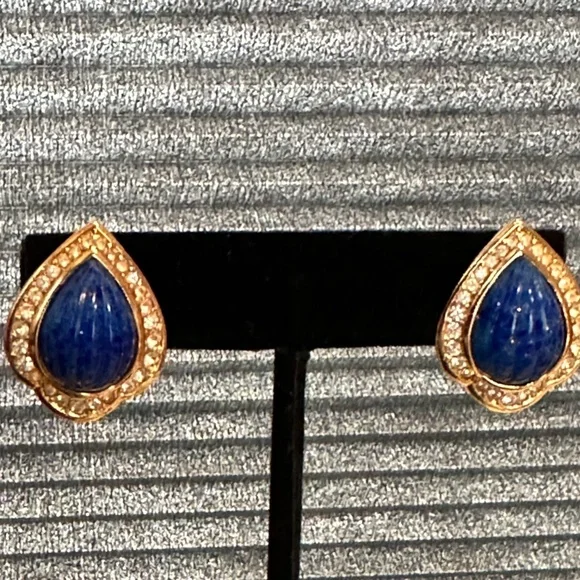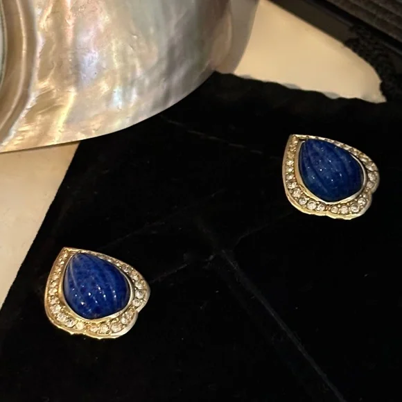 Cristian Dior Earrings - Faux Blue Lapis Lazuli & Chrystal Set in Gold - Vtg 90sBeautiful Vintage Christian Dior Earrings are gold tone metal with faux blue melon cut lapis lazuli...