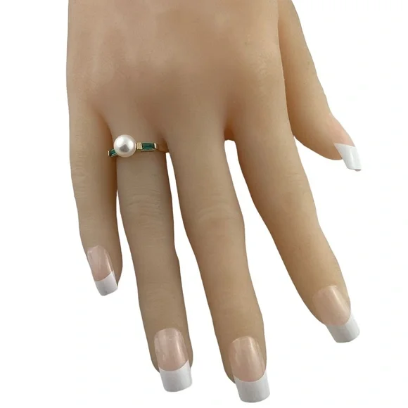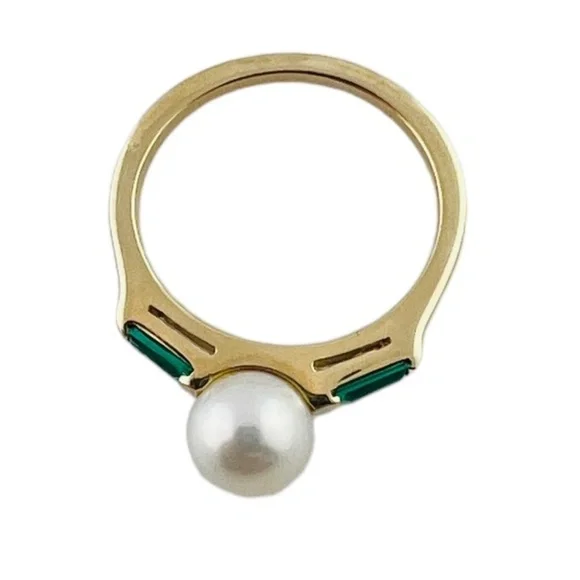 14K Yellow Gold Cultured Pearl Lab Created Emerald Ring Size 5 #15676