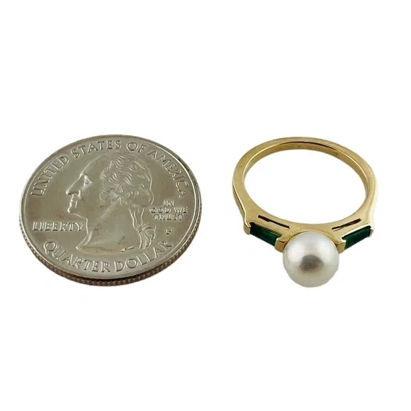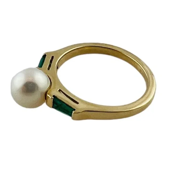 14K Yellow Gold Cultured Pearl and Lab Created Emerald RingThis beautiful ring is set in 14K yellow gold. The center culture pearl is approx. 7mmPearl is surrounded by 2 lab created emerald baguettesSize 51.8 mm shank2.9 g / 1.8 dwtStamped 14K BROGAVery good preowned condition. Just polished by our jeweler.Will be shipped priority mail with insurance in a gift box.AD10292023/17KCSJAGI ID 10/16/23