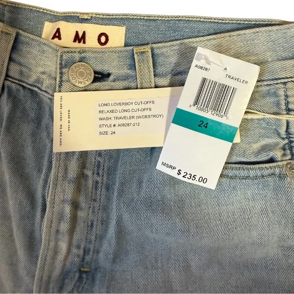 AMO Long Cut-off Denim Shorts- Size 24- NWT! (Open to offers)- Distressed light wash cut-offs- Inseam: 9”- Length from band to cuff: 19”- Button fly closure