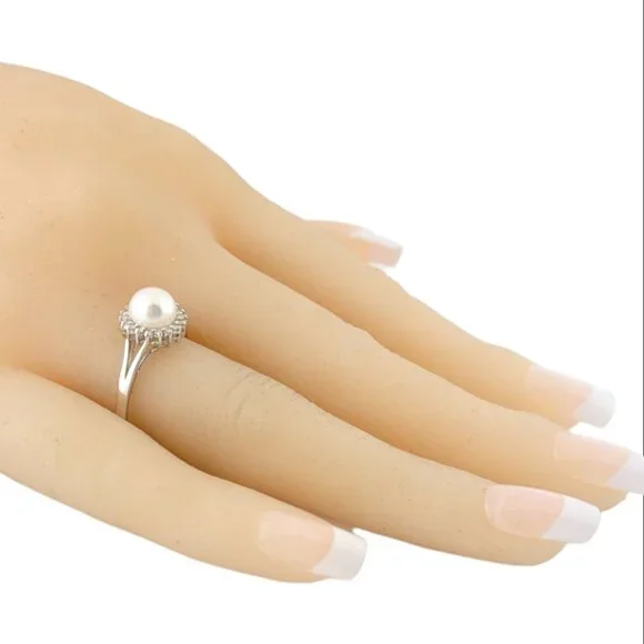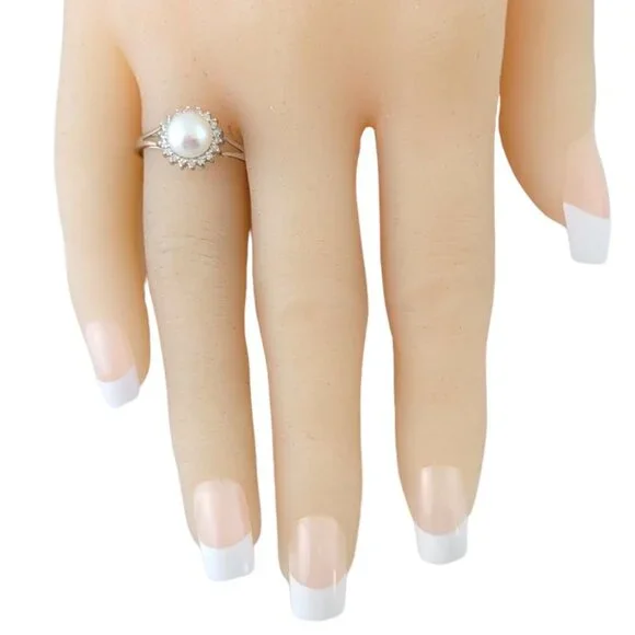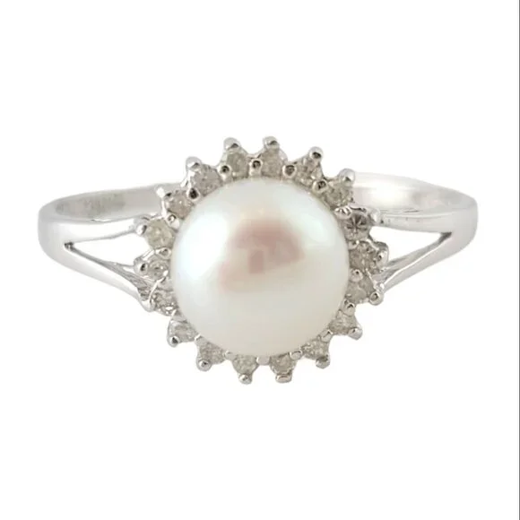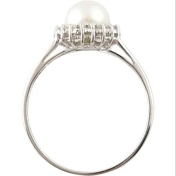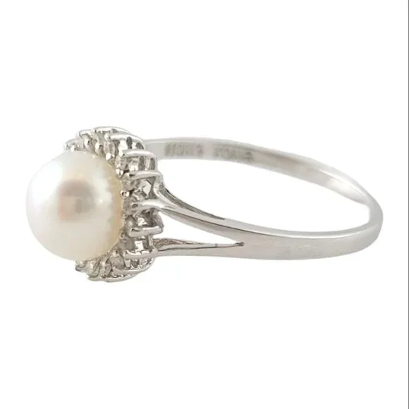 Vintage 14 Karat White Gold Pearl and Diamond Ring Size 9.25-This elegant ring features one round white pearl (7 mm) and 18 round single cut diamonds set in classic 14K white gold. Shank: 1.5 mm.Width: 10 mm.Approximate total diamond weight: .15 ct.Diamond color: J-KDiamond clarity: I2-I3Ring Size: 9.25Weight: 2.2 gr./ 1.4 dwt.Stamped: Hong Kong 14KVery good condition, professionally polished.Will come packaged in a gift box or pouch (when possible) and will be shipped U.S. Priority Mail Insured.DV073123/17KCS