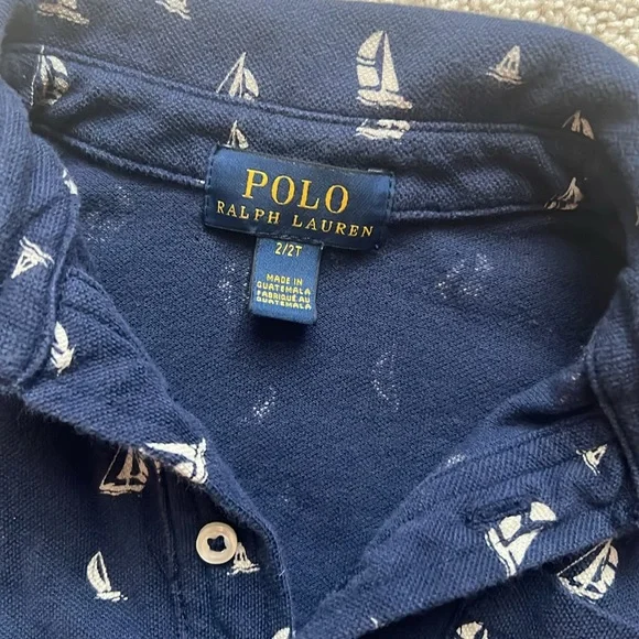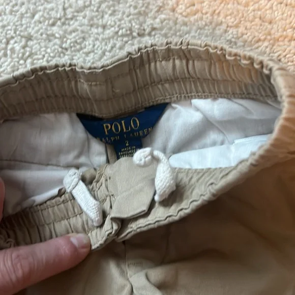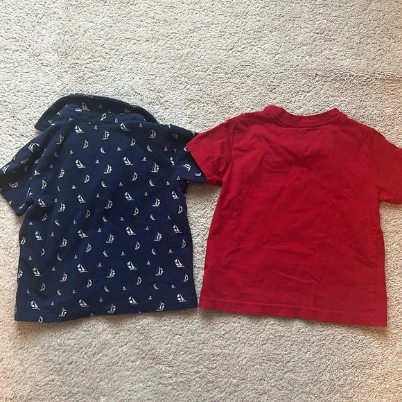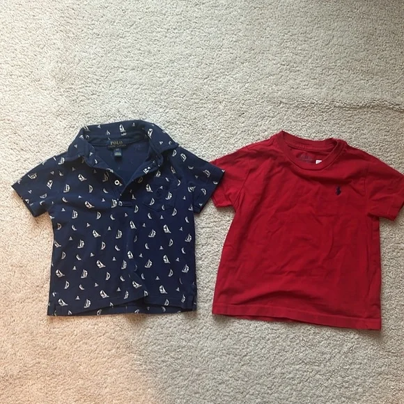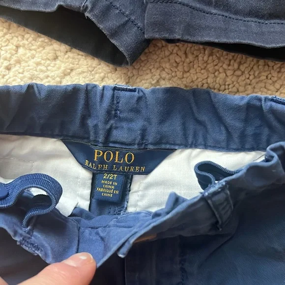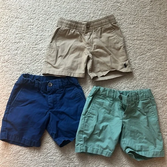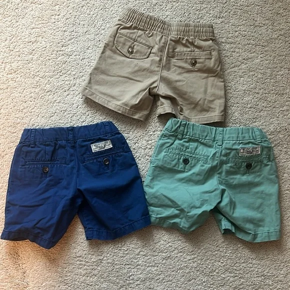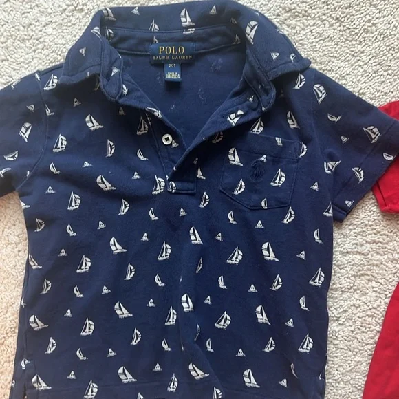 Bundle of clothes from Polo. 3 pairs of shorts, green, khaki and navy blue. Shorts have either drawstring or adjustable waistbands. Polo navy shirt with little sailboats, red polo...