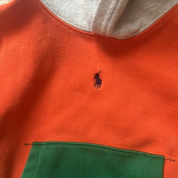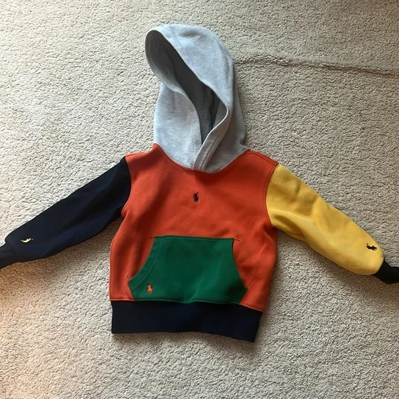Bundle of clothes from Polo. 3 pairs of shorts, green, khaki and navy blue. Shorts have either drawstring or adjustable waistbands. Polo navy shirt with little sailboats, red polo t-shirt and color blocking Polo sweater with orange, green, yellow and gray design and little polo logos. Adorable for a preppy toddler boy! All size 2T and all in excellent condition.