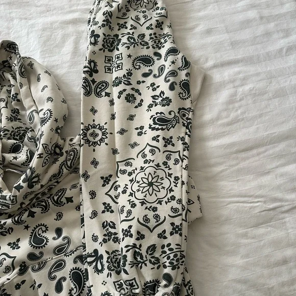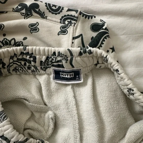 Kith set featuring a paisley design. Cream and black colors. This is a KITH matching hoodie and jogger sweatpants set featuring a paisley bandana print, which is a recognizable...