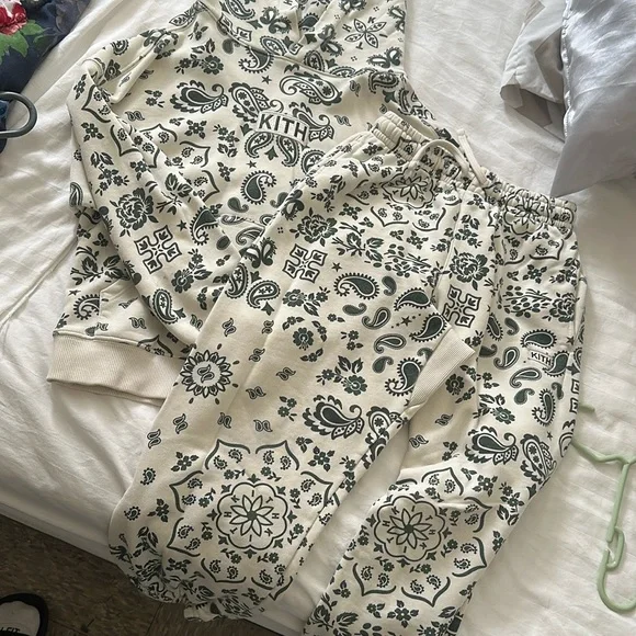 Kith set featuring a paisley design. Cream and black colors. This is a KITH matching hoodie and jogger sweatpants set featuring a paisley bandana print, which is a recognizable and sought-after design from the brand.