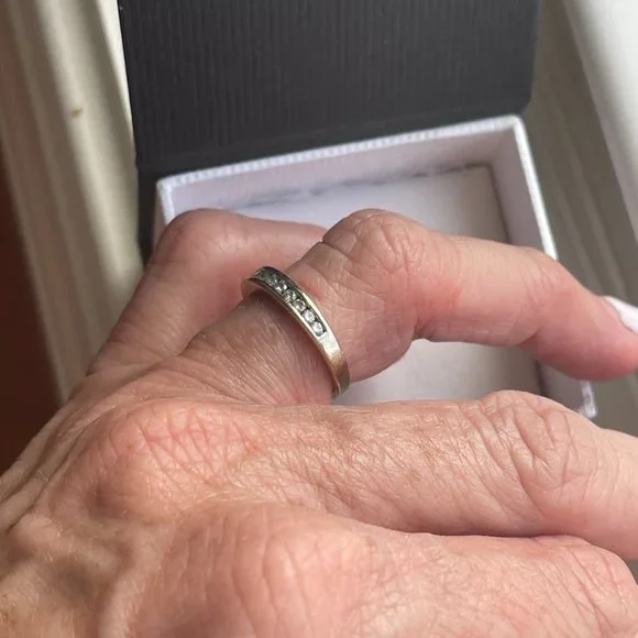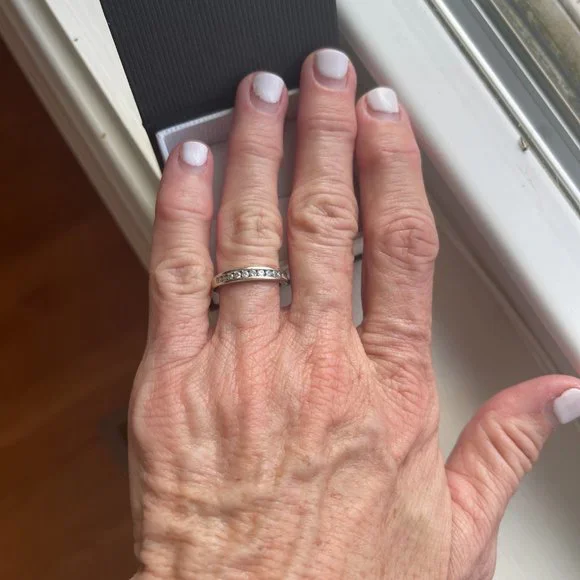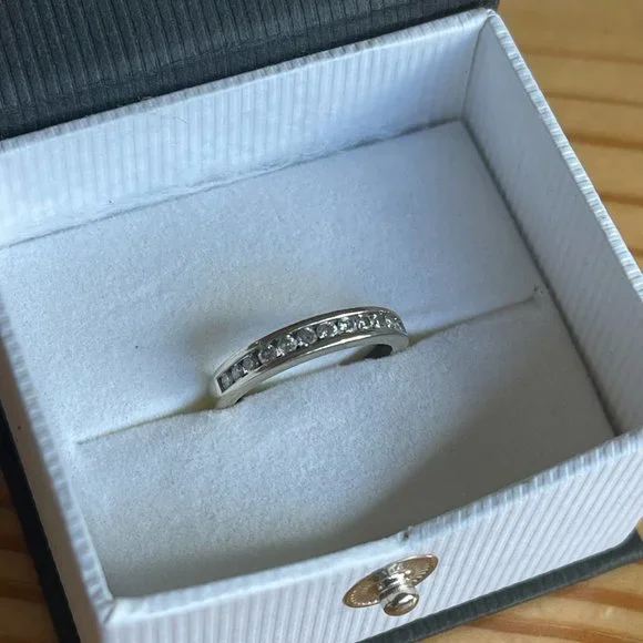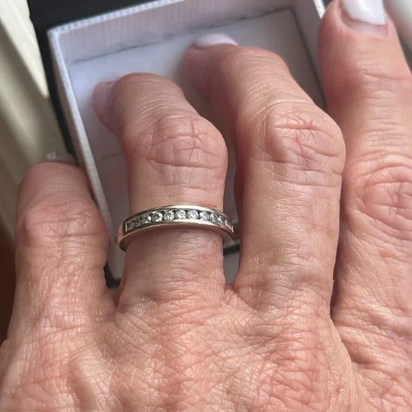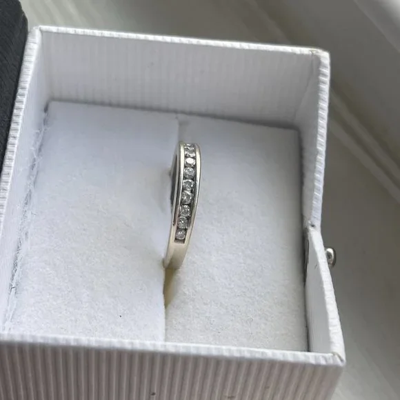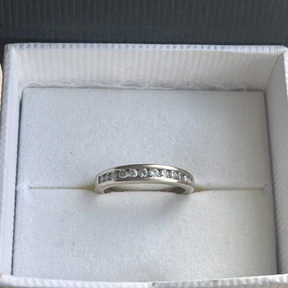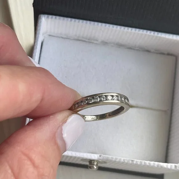14K White Gold Round Diamond Band.25 ct12 diamondsSize 4.53mm wide bandBeautiful comfortable sparkly band!