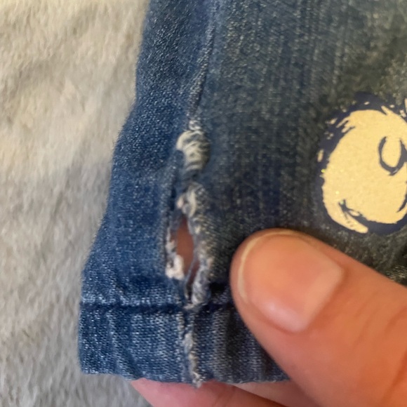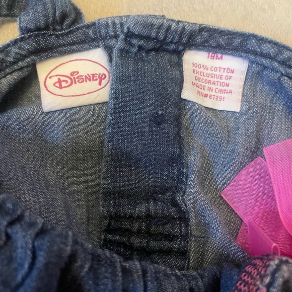 Adorable Disney denim dress. Features pink stitching and charming details.