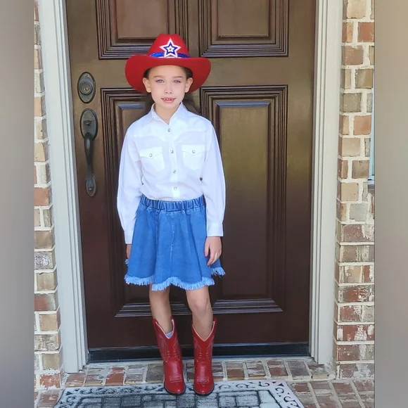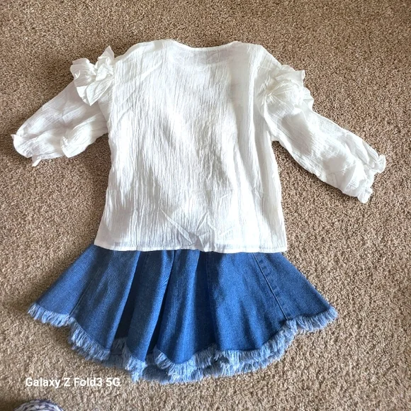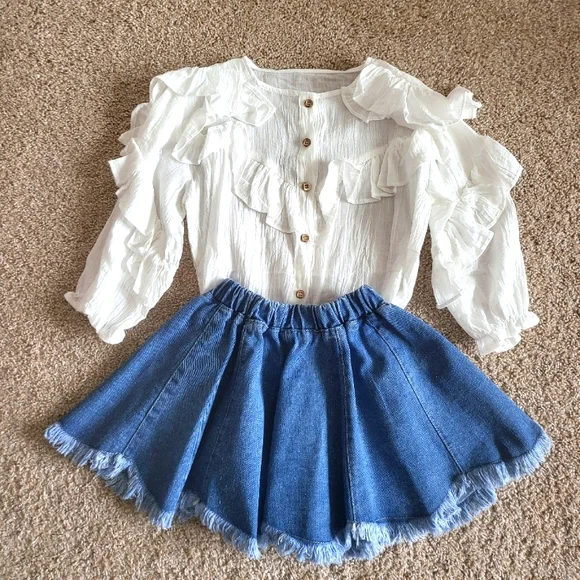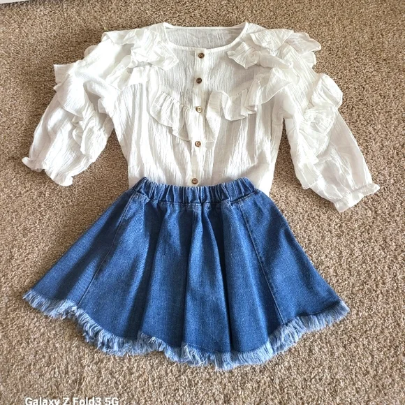 Beautiful girls western set.The top is a cotton gauze, with lovely ruffles and long, slightly puffed sleeves.Button downThe skirt is a medium cotton denim that flairs out with a...