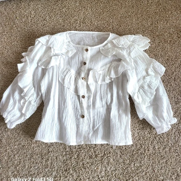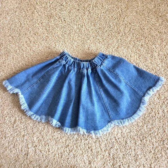 Beautiful girls western set.The top is a cotton gauze, with lovely ruffles and long, slightly puffed sleeves.Button downThe skirt is a medium cotton denim that flairs out with a scalloped distressed bottom edge.elastic waistsize 6Looks perfect with her cowboy boots and hat!Please note that only the skirt was worn for a Western pagent. The blouse was never worn.see last photoExcellent condition, no damage Mia Belle