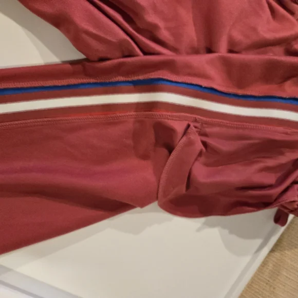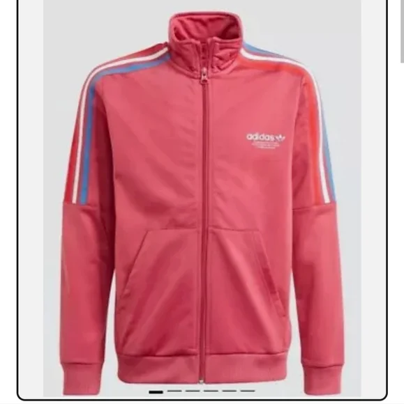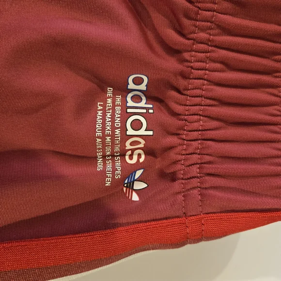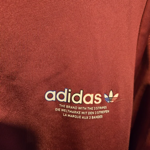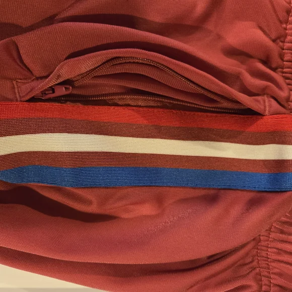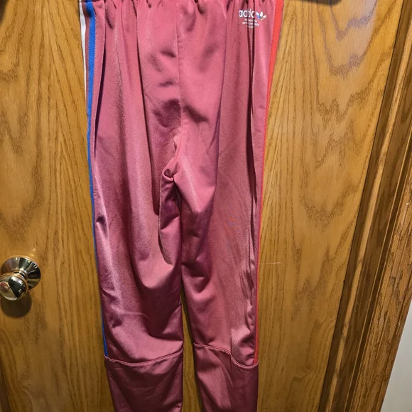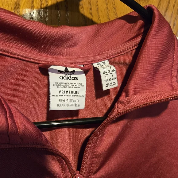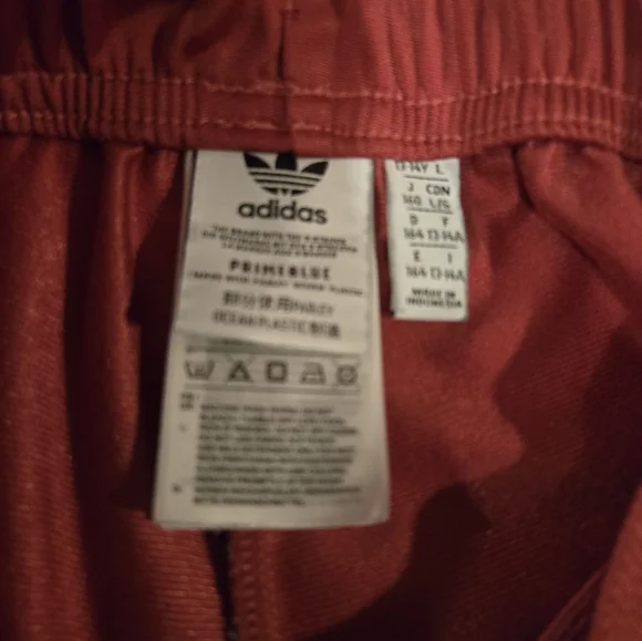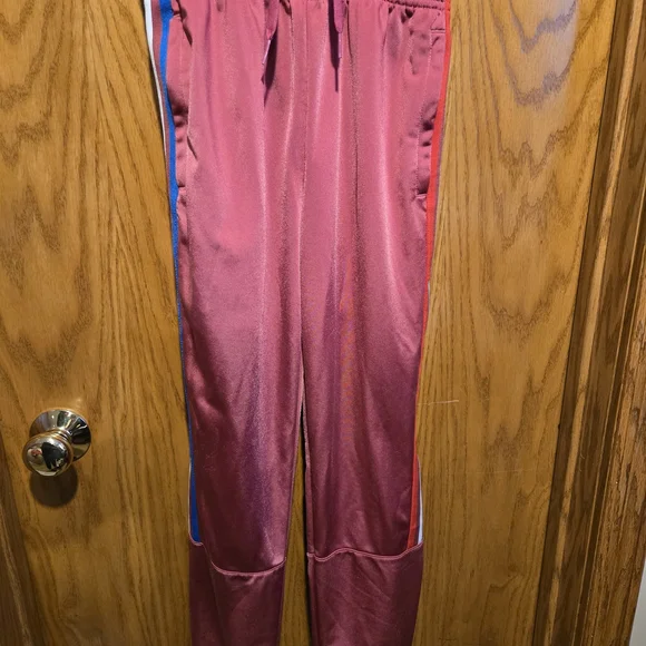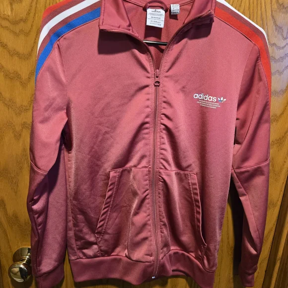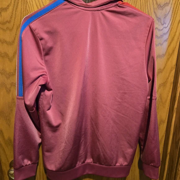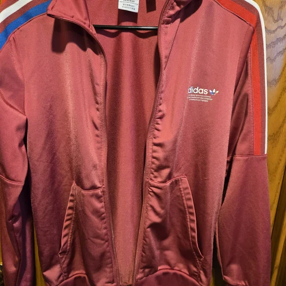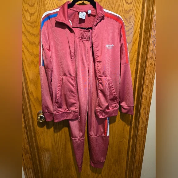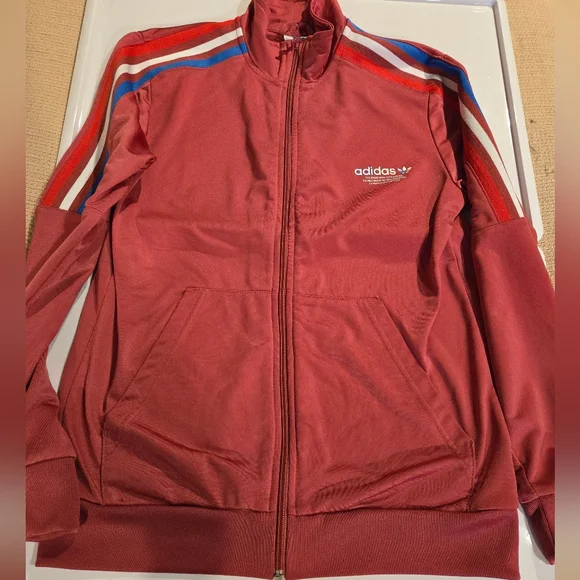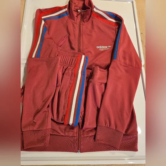 Stylish Adidas PRIMEBLUE tracksuit in dusty red color with red, blue and white stripes. Perfect for casual wear. Youth Large 13-14Y. Pants have zippered pockets and elastic bottoms.Rarely worn, used like new. No stains, tears or holes. Strong elastic and drawstring. Smoke-free home.
