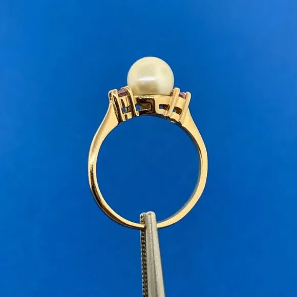 * 14K Yellow Gold Pearl Amethyst Accent Ring* Ring size: 4.5* Top of ring measures: 1/4" x 1/2"* Height: 3/8"* Band width: 2.15 mm* Pearl measures approximately 6.45 mm* Amethysts...