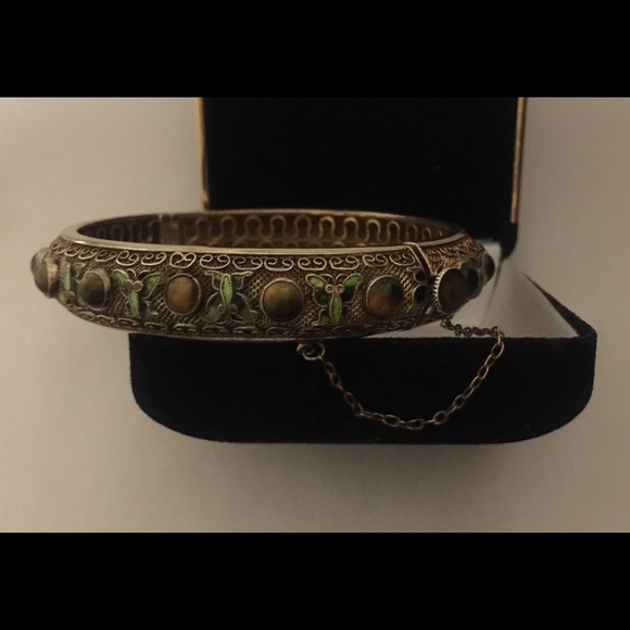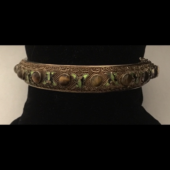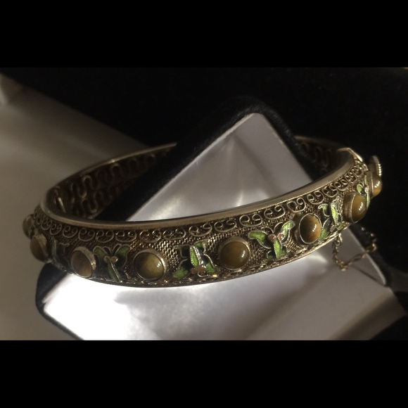 • Sterling Vermeil Enamel Filigree Bracelet• Vintage Asian Green Enamel Butterflies • Cabochon Tiger Eye Stones • Safety Chain• Dimensions:Internal Circumference Approx....