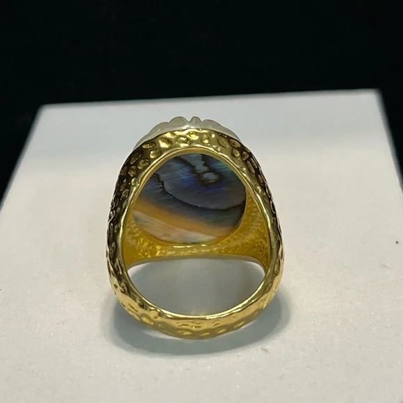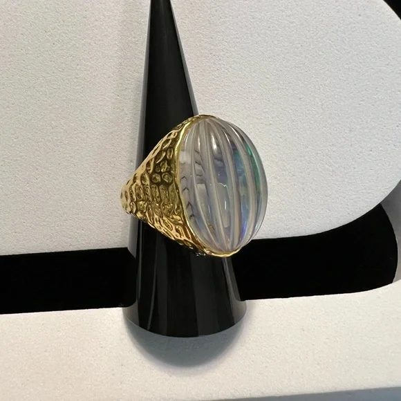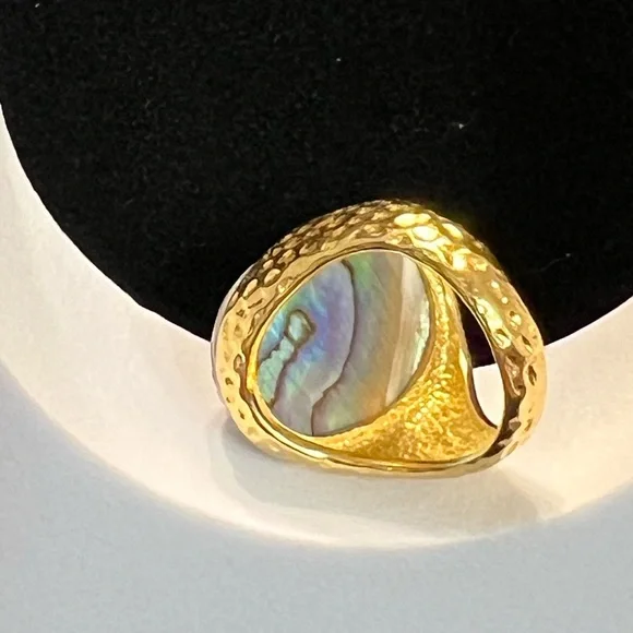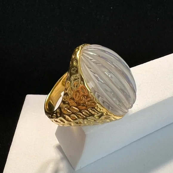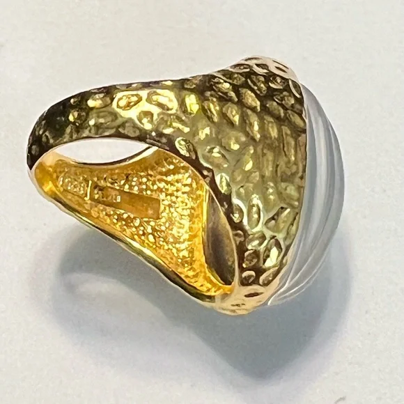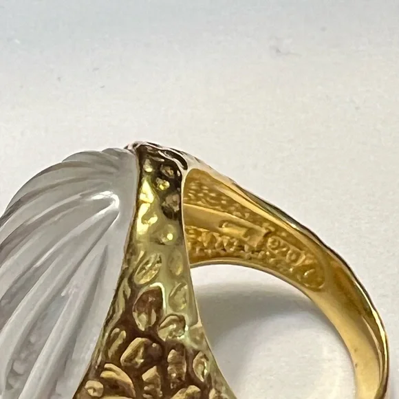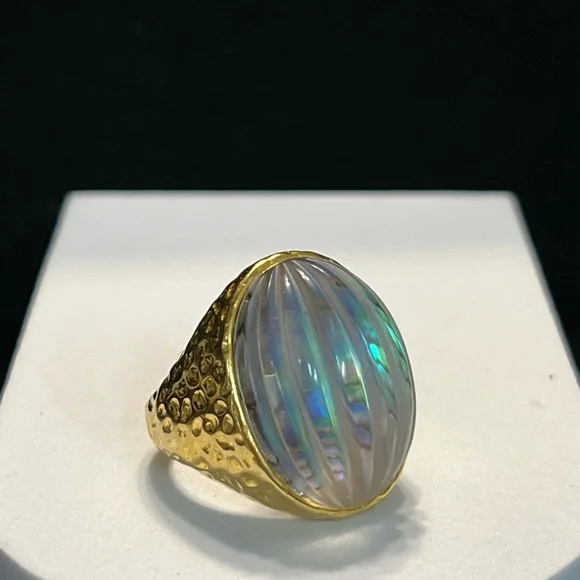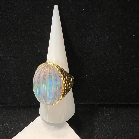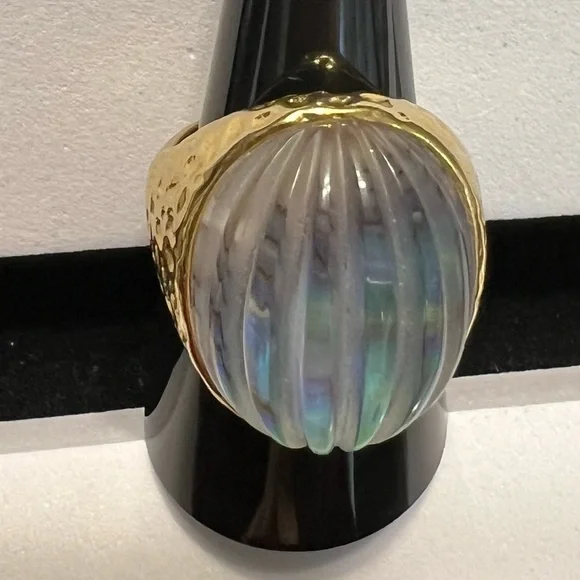 • Sterling Vermeil Scalloped Art Glass Ring• Gorgeous Scalloped Carved Art Glass Dome Design• Beautifully Textured Mounting• Art Glass is Backed With Abalone• Hallmarked 925 Italy• Dimensions: Ring Size 8 3/4