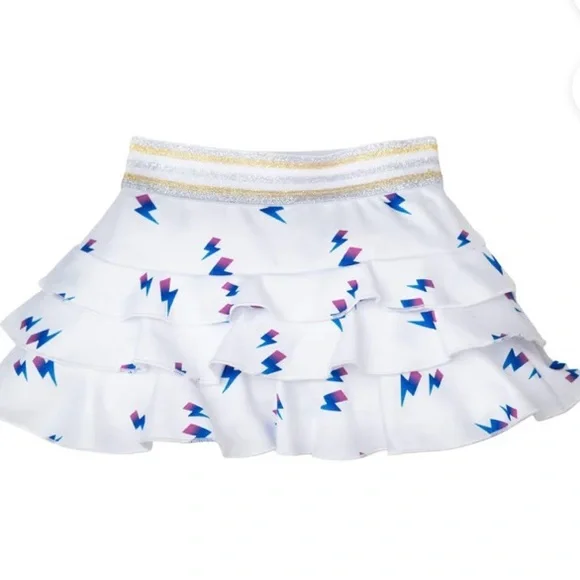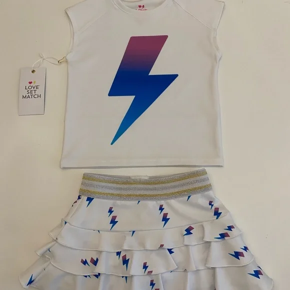 Love Set Match Girls Tennis Outfit. Flash Skirt and Shirt. The shirt has a relaxed fit with a slight crop and capped sleeves. In sporty fabric- 90% polyester and 10% spandex The skirt is the same fabric and has a playful tutu style, built in shorts and a glitzy waistband. Size XS- age 4-5 Brand new with tags!