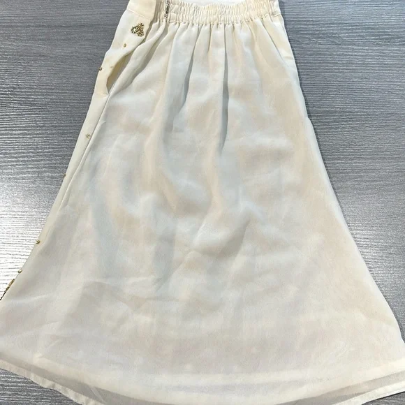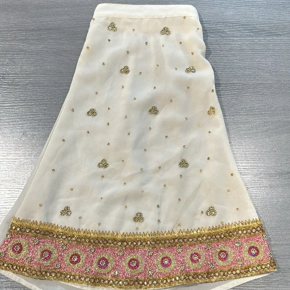 Girls beautiful two-piece beaded Indian outfits cream, gold, and pink skirt and top. There is a stain on the back of the top that you can see in the last photo. There is no tag...