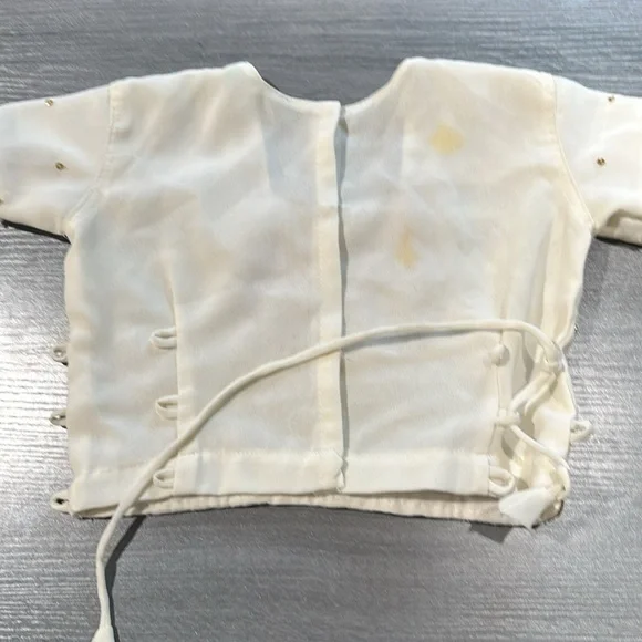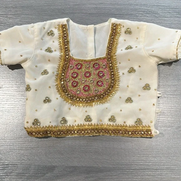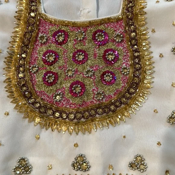 Girls beautiful two-piece beaded Indian outfits cream, gold, and pink skirt and top. There is a stain on the back of the top that you can see in the last photo. There is no tag that says the size but I think it will fit about a 2T to 3T.