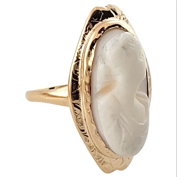 Vintage 14K Yellow Gold Cameo Ring Size 3.74Gorgeous cameo ring crafted from 14K yellow gold for a beautiful finish!Ring size: 3.75Shank: 1.7mmSize: 23.8mm X 13.6mm X 6.4mmWeight: 3.3 g/ 2.1 dwtHallmark: 14KVery good condition, professionally polished.Will be packaged in a gift box or pouch (when possible) shipped US Priority Mail with insurance. MM112123/17KCS