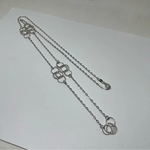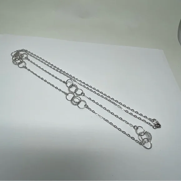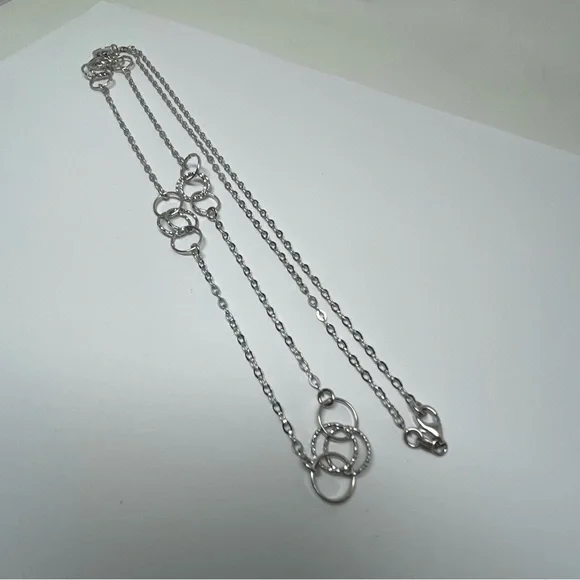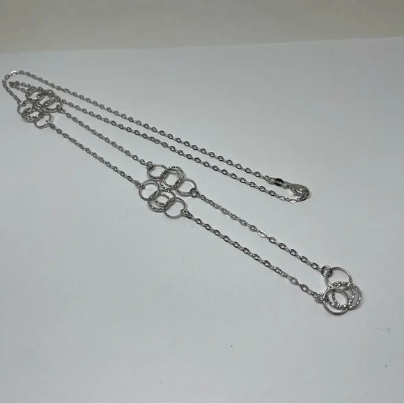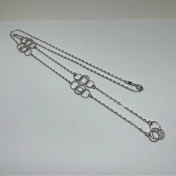 Sterling silver 925 Five stations necklace, rhodium finished non-tarnishing, stations are two smooth circles with two diamond-cut faceted circles, 35.5” in length, 13.1 grams, comes in an organza pouch, gently worn.