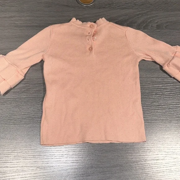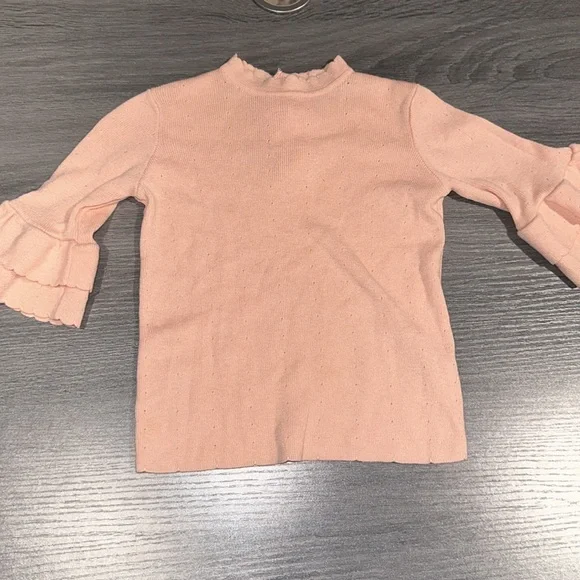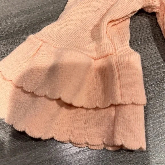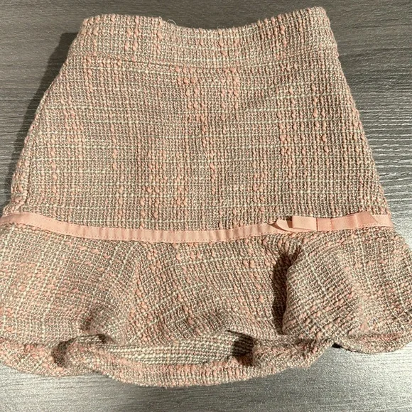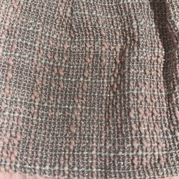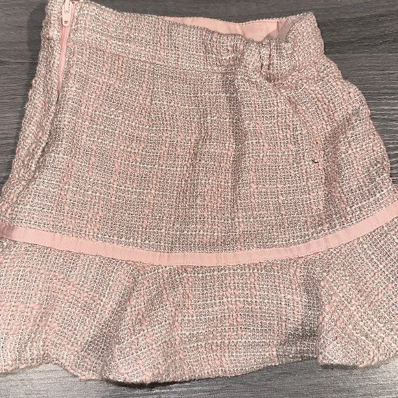 Baby pink knit, lightweight sweater, scallop edge, detail at the neck, ruffle bell sleeves with the matching skirt the skirt is like a tweed silvery gray with pink trim, bow, detail, and ruffle at the bottom in excellent condition