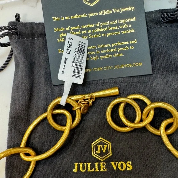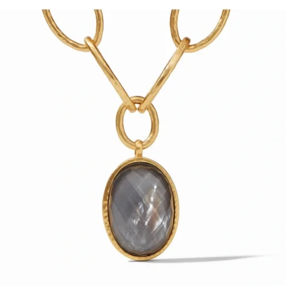 Statement size oval rose cut jewel suspended from a shimmering hammered link with a toggle closure.24K gold plate21 inch lengthImported glass, mother of pearlColor: Iridescent...