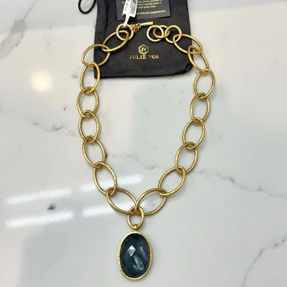 Statement size oval rose cut jewel suspended from a shimmering hammered link with a toggle closure.24K gold plate21 inch lengthImported glass, mother of pearlColor: Iridescent Charcoal Blue