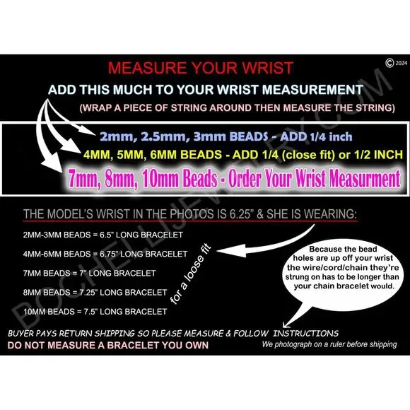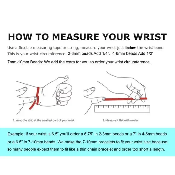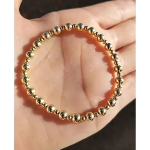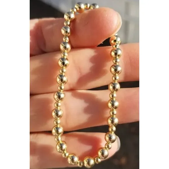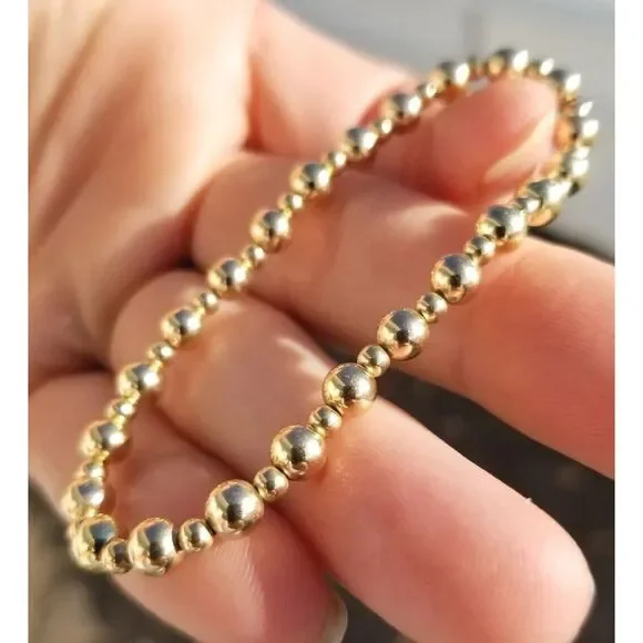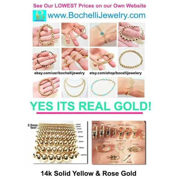 ** Lower Prices No Sales Tax on Our Website BochelliJewelry.com (not on here - on our own site)***THIS IS A HANDMADE ITEM AND IS STAMPED 14K ON THE CLASP***THIS LISTING IS FOR ONE SOLID 14K 5MM AND 3MM GOLD BEAD BRACELET STRETCH OR LOBSTER CLASP14k Solid Yellow or Rose Gold 5mm AND 3mm Round Beads (2-12mm also avail c shop) - White Gold is NOT available.Choose Stretchy or 14k Solid Yellow or Rose Gold 8.4mm Pear Shaped Lobster ClaspFlexible Non-Tarnish Steel Wire with Clasp Option or Stretchy Clear CordMEASURE YOUR WRIST WRIST WRIST BEFORE Ordering. DO NOT MEASURE YOUR CHAIN OR BEAD BRACELET.*** We waste several hours remaking bracelets every week due to customers refusing to measure their wrists and then add the recommended extra length as stated in the photo.* Wrap a string around and then measure that with a ruler then add the extra length as stated in the photo. Contact us if you need help deciding what length to order.* BUYER PAYS RETURN SHIPPING so please take a second to Measure Your WRIST/NECK so we can make you the right size the first time. We charge for additional materials needed to lengthen exchanges and it takes 5 days to reship remakes.• IMPORTANT: Measuring a Chain Bracelet or other bracelet/necklace made of different size beads than you are ordering from us will cause errors. Measure Your Wrist/Neck!• We Photograph Items on a Ruler Before Shipping. If you believe we sent the wrong size, send us a photo of it on you