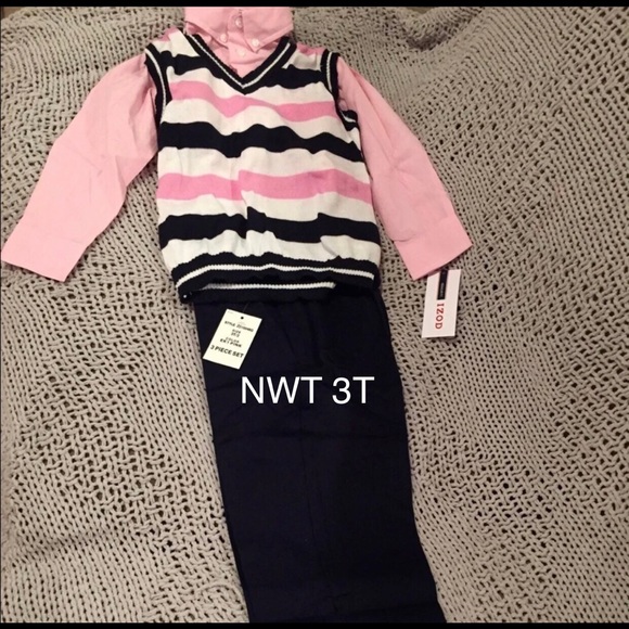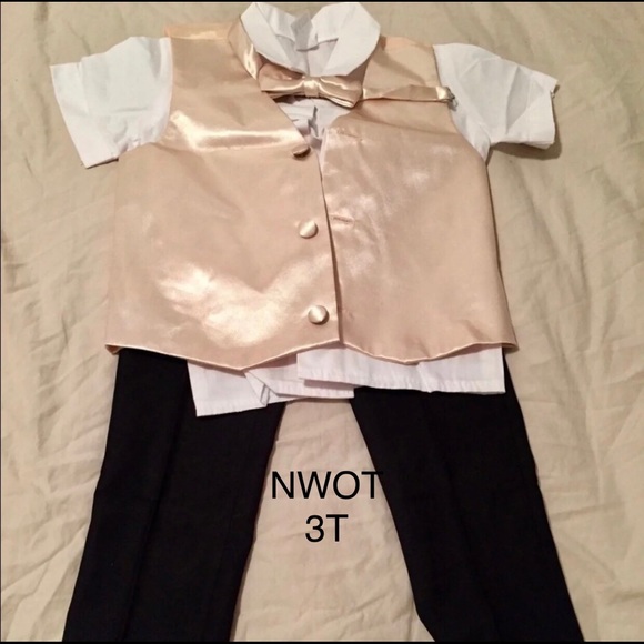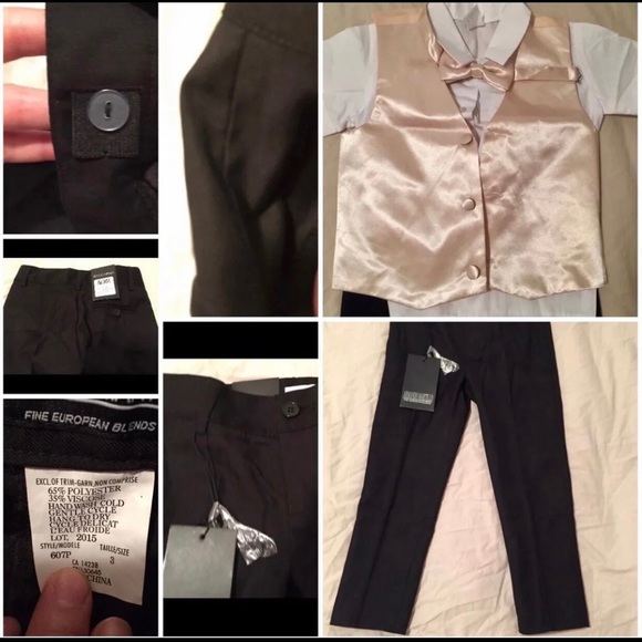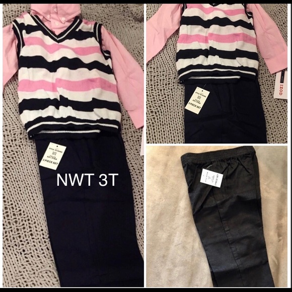 Included:—NWT 3T 4PC IZOD Suit*plain tan pants, w/ non-adjustable elastic waistband; w/o pockets;*plain orange gingham pattern shirt; w/o pocket;*plain tan vest;*orange & blue striped tie—NWT 3T Boutique Suit*white short sleeve shirt, *beige vest w/ bow tie, *fitted black pants w/ front & back pockets, adjustable waistband & belt loops—NWT 3T 3-PC Izod Outfit *Pink & White Small Gingham Shirt*Pink Stripe Vest*Navy Blue Pants w/ functional pockets & belt loops