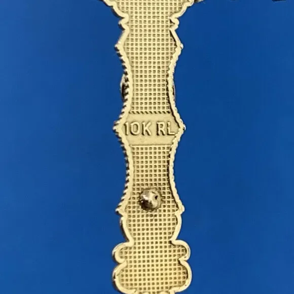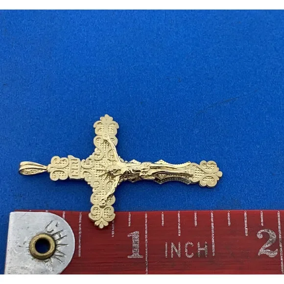 * Designer 10K Yellow Gold Textured Crucifix Cross Religious Statement Pendant* Length: 1-5/8" including the bale* Width: 15/16"* Weight: 1.9 g* Marked: RL * 10K* Chain is not...