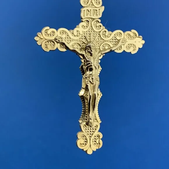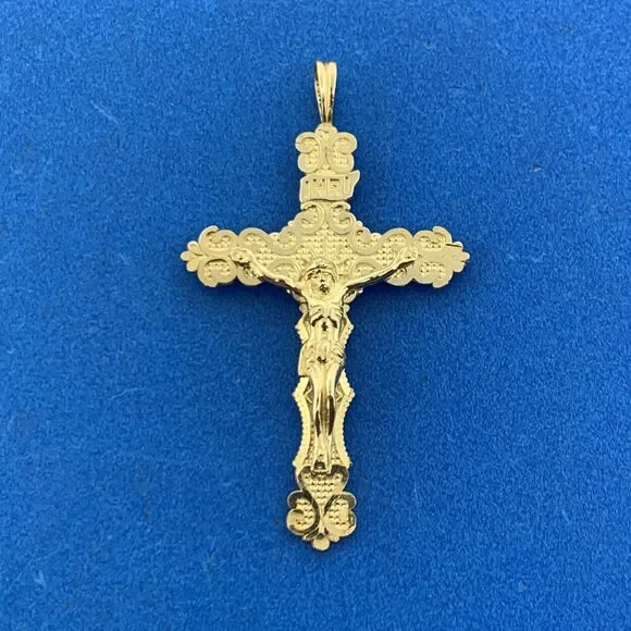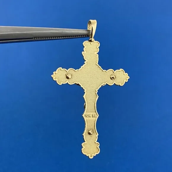 Designer 10K Yellow Gold Textured Crucifix Cross Religious Statement Pendant