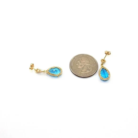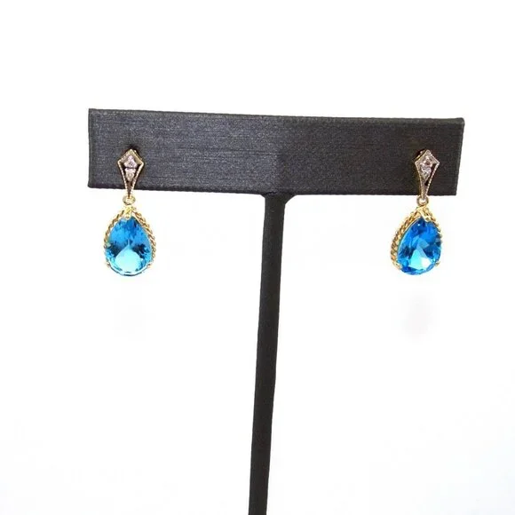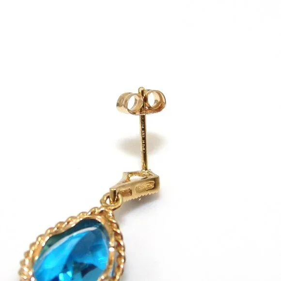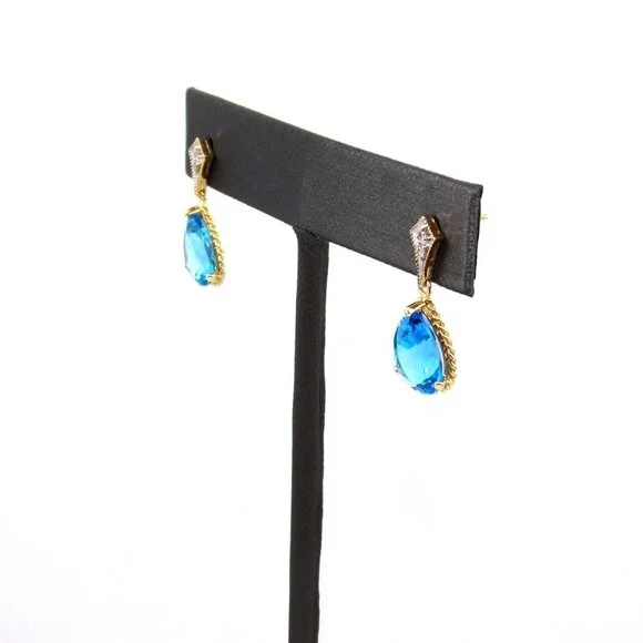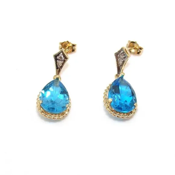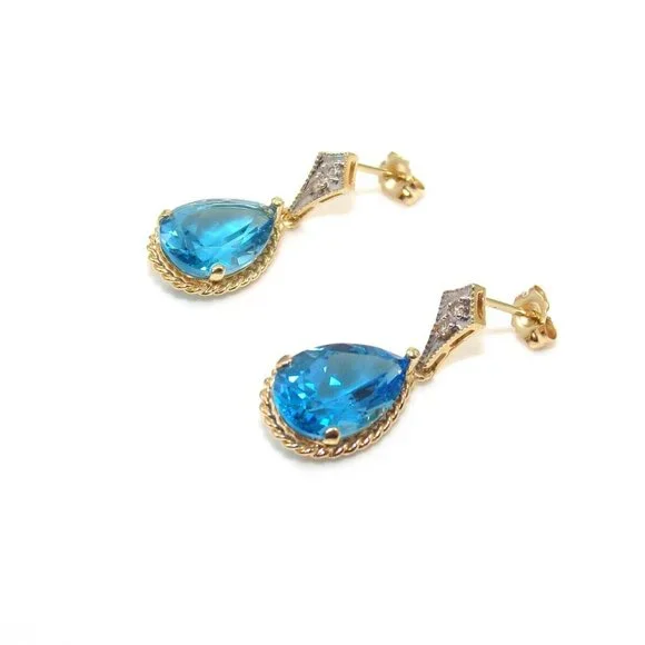 14K Yellow Gold Earrings Blue Topaz Diamond Dangle