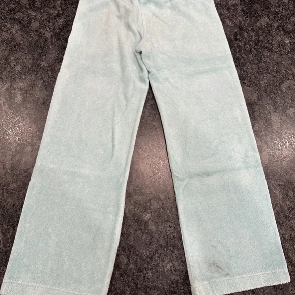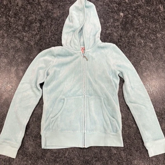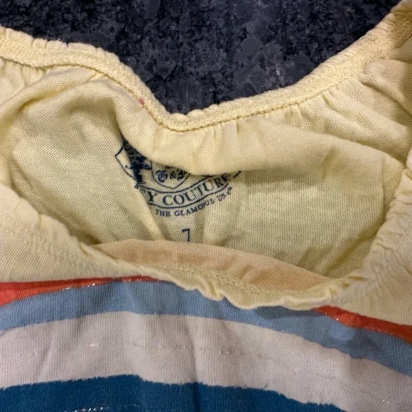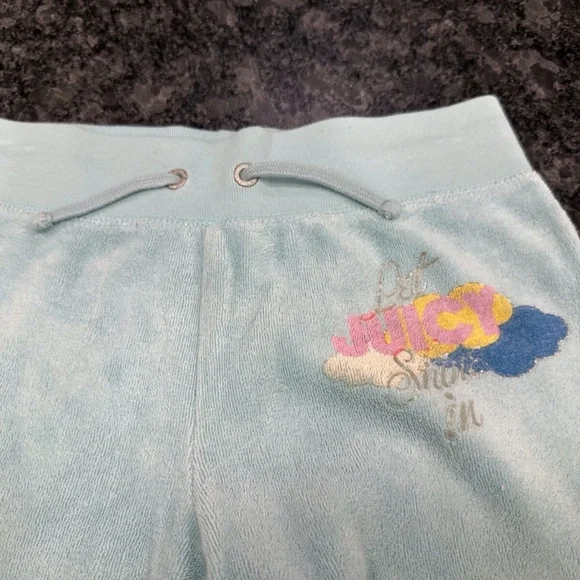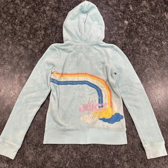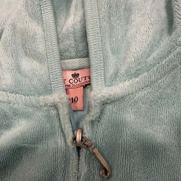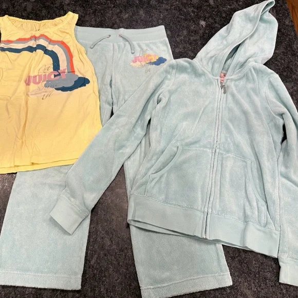 Girls Juicy Couture 3 Piece Matching Set Jacket Pants TshirtJacket - size 10Pants - size 7Tshirt - size 7very good condtionthere is some dirt on bottom of pant leg as shown in photoonly hung to drypurchased from Neiman Marcus