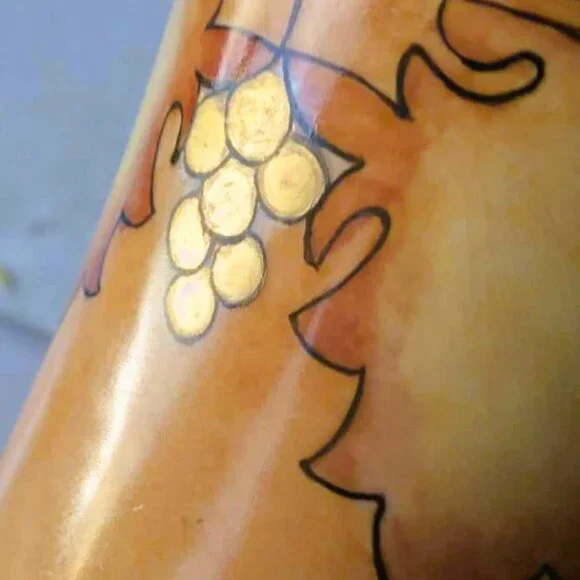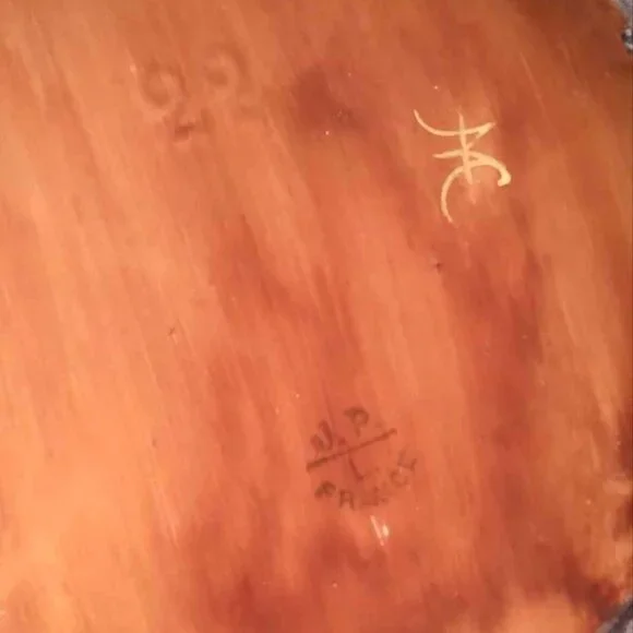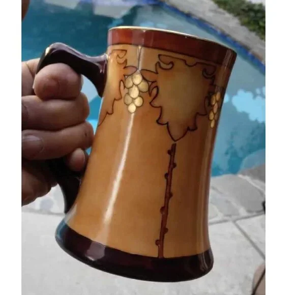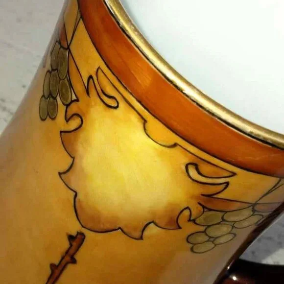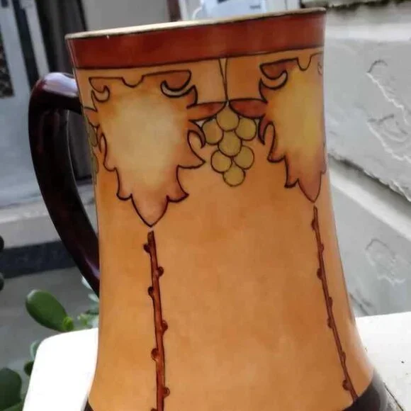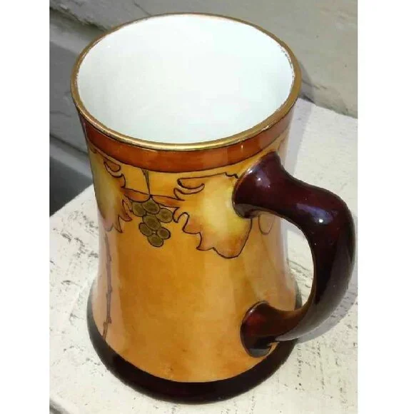 J.P. Limoges France Hand-Painted Grape Porcelain Mug with Stunning Gold AccentsThis is a beautiful Antique Hand-Painted Grape Porcelain Mug with Stunning Gold Accents by J.P. Limoges of France.The Mug/Tankard is made of porcelain and is meticulously hand painted featuring warm shades of tawny browns and ambers with gold accents in the grapes an top rim.The piece has the makers marks on the underside with the JPL France, #22 and the artists signature/mark done in gold gilding.The piece was created in the early 1900´s.The piece measures approximately 5.5" tall by 4" at the base and 5.5" wide handle side and is in excellent antique condition withno chips, cracks, or repairs, hand-painted details remain vibrant and intact, and the gold accents show minimal wear, consistent with its antique age.This is a lovely antique art piece that would add a unique, classy accent to any environment.