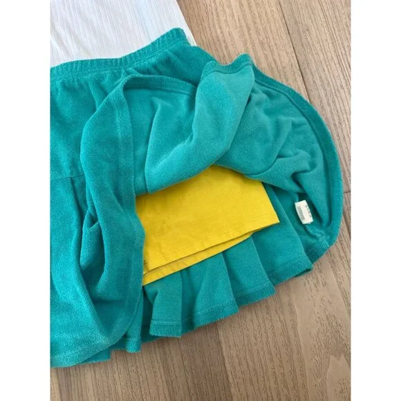 • White sleeveless top with ruffle details• Green pleated skirt with yellow embroidered detail• Comfortable elastic waistband on skirt• Soft and breathable material• Lining for added comfortTank = Size 10Skort = Size 8Size: Girls 8/10Condition: Pre-Owned Good