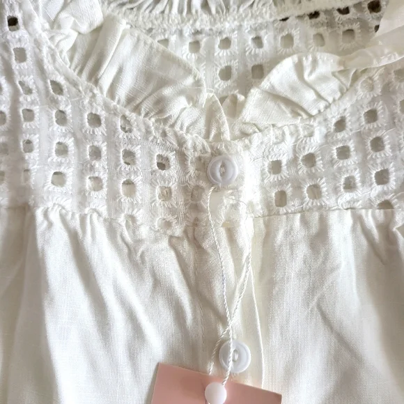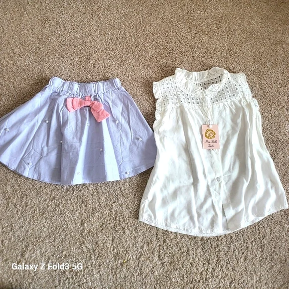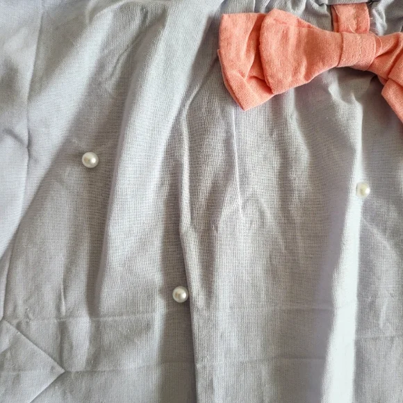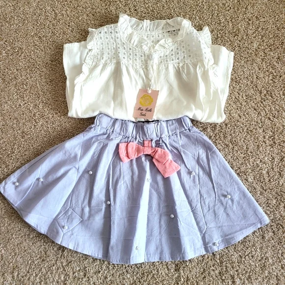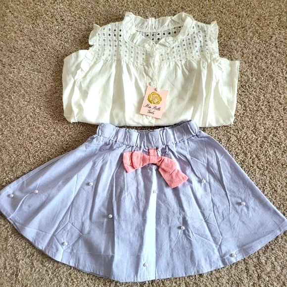 White soft cotton blend top is sleeveless with an eyelet yoke and ruffles around the neck. Button up closure Light periwinkle blue skirt has faux pearls attached to the front and a pink center bow.elastic waistsize 6DRY CLEAN ONLYNWTbrand new, never wornExcellent condition, no damage