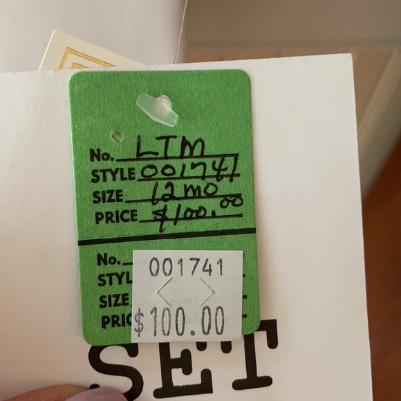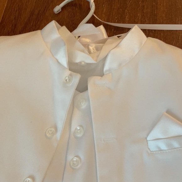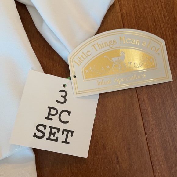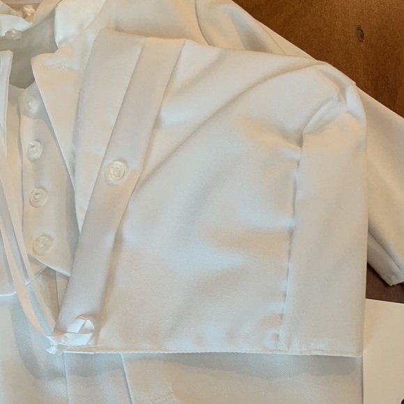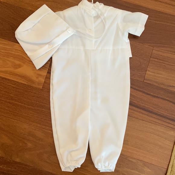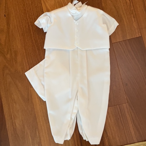 New Little Things exquisite christening/special occasion outfit. Poly/rayon blend. Removable jacket, long all and hat. Very cute. Style 1741