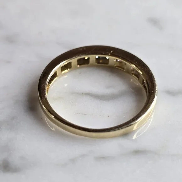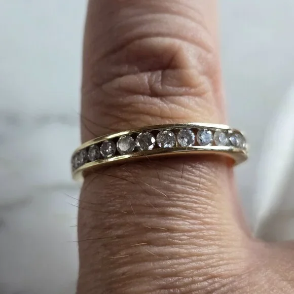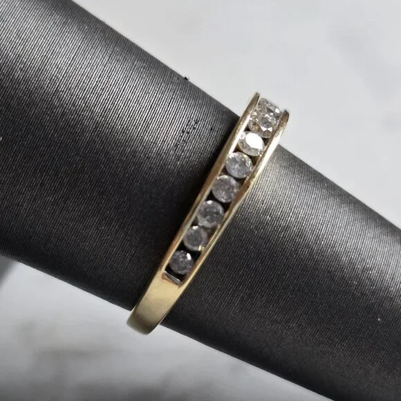 A WOMENS VINTAGEESTATE 10K YELLOW DIAMOND GOLD RING WITH A TOTAL OF ABOUT.14ctsOF DIAMONDS.THE TOTAL WEIGHT IS 2.2g, AND IS A SIZE 7.25.THE WIDTH OF THE RING IS 1/8".RING IS MARKED 10k ON THE INSIDE OF THE BAND.ANY QUESTIONS PLEASE DONT HESITATE TO ASK.BE SURE TO CHECK OUT SOME OF OUR OTHER GREAT ITEMS UP FOR SALE.THANK YOU.