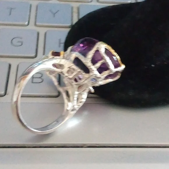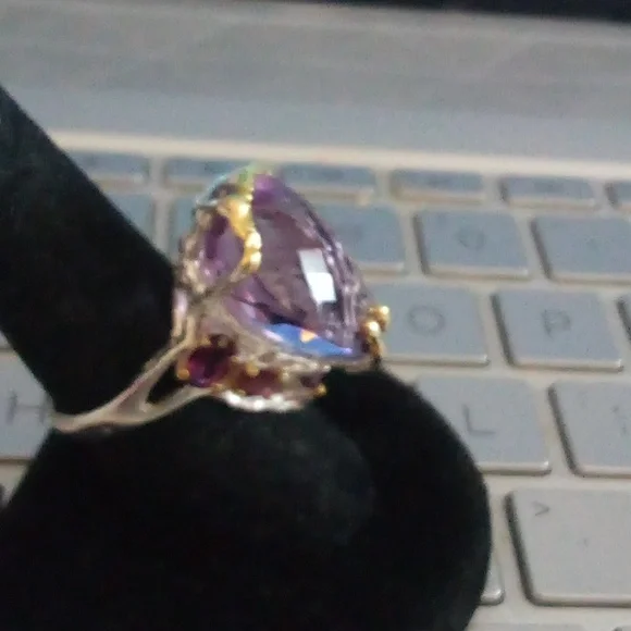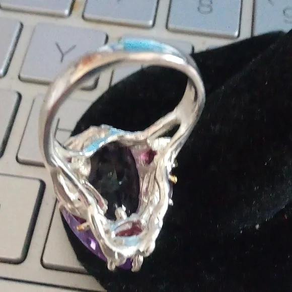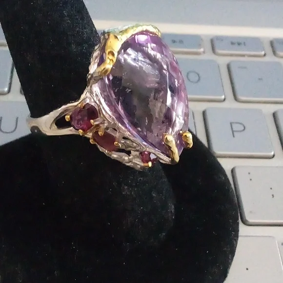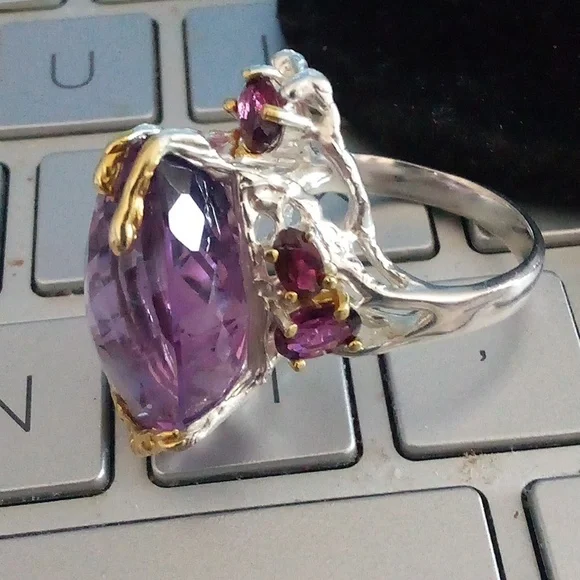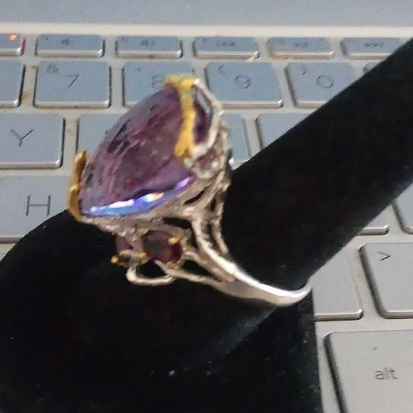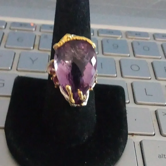 This is app 35 cts of fully faceted natural African Amethyst. Set in fine silver with 14KT gold trim and natural Garnet accents. This is an IF quality stone and one of a kind. The ring weighs 12.9 grams and is a Size 8 AAA