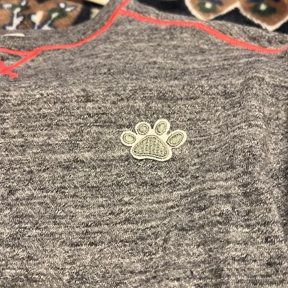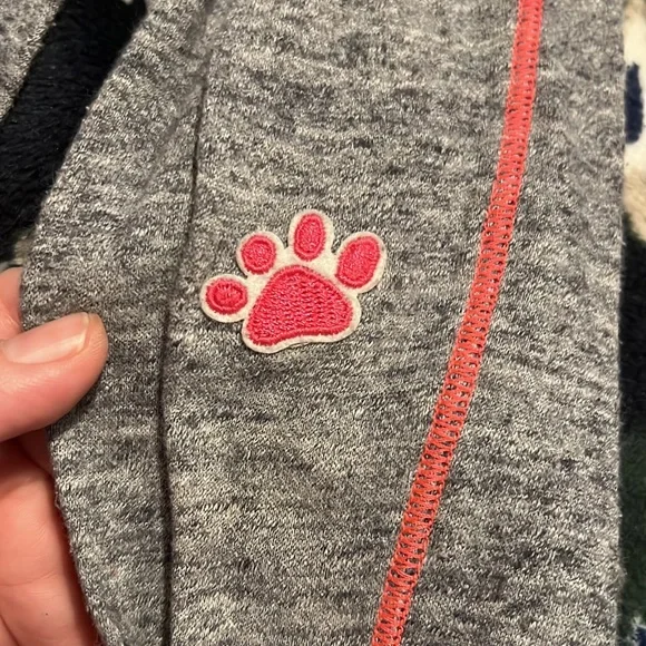The paw prints were added to cover a flaw in the knee so my granddaughter could continue to wear (see last pic) hole is/was only in one knee. Shirt needs ironing lol otherwise...