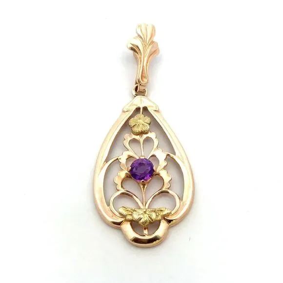 * Designer Memco 10K Yellow Gold Round Amethyst Floral Floral Oval Pendant* Length including bale: 1-3/8"* Inner bale measures: 5 mm x 2.7 mm * Width: 5/8"* Weight: 1.2 tgw* 1...